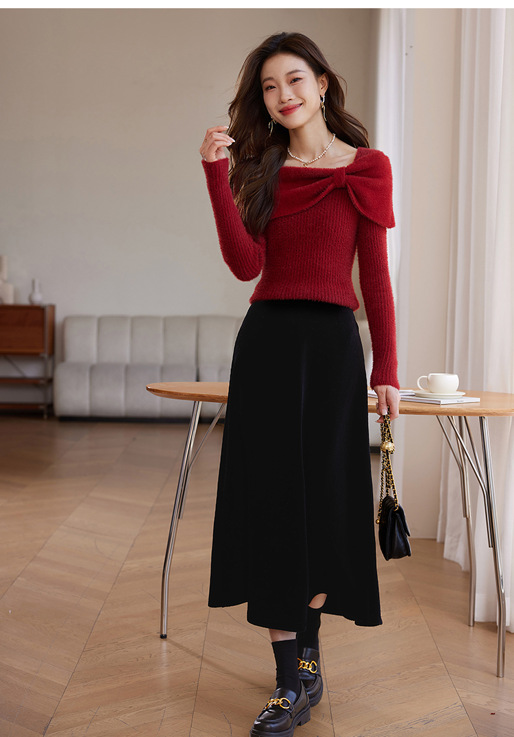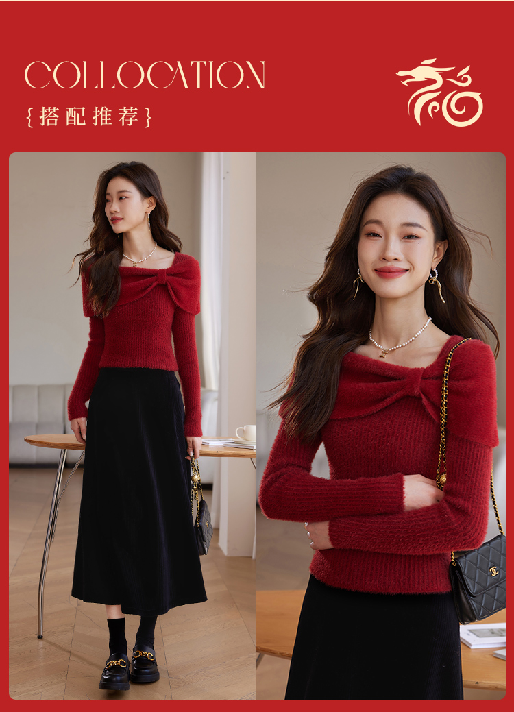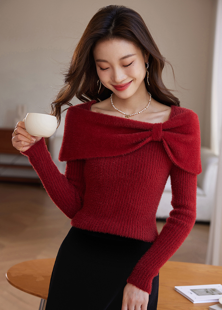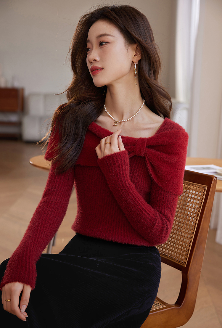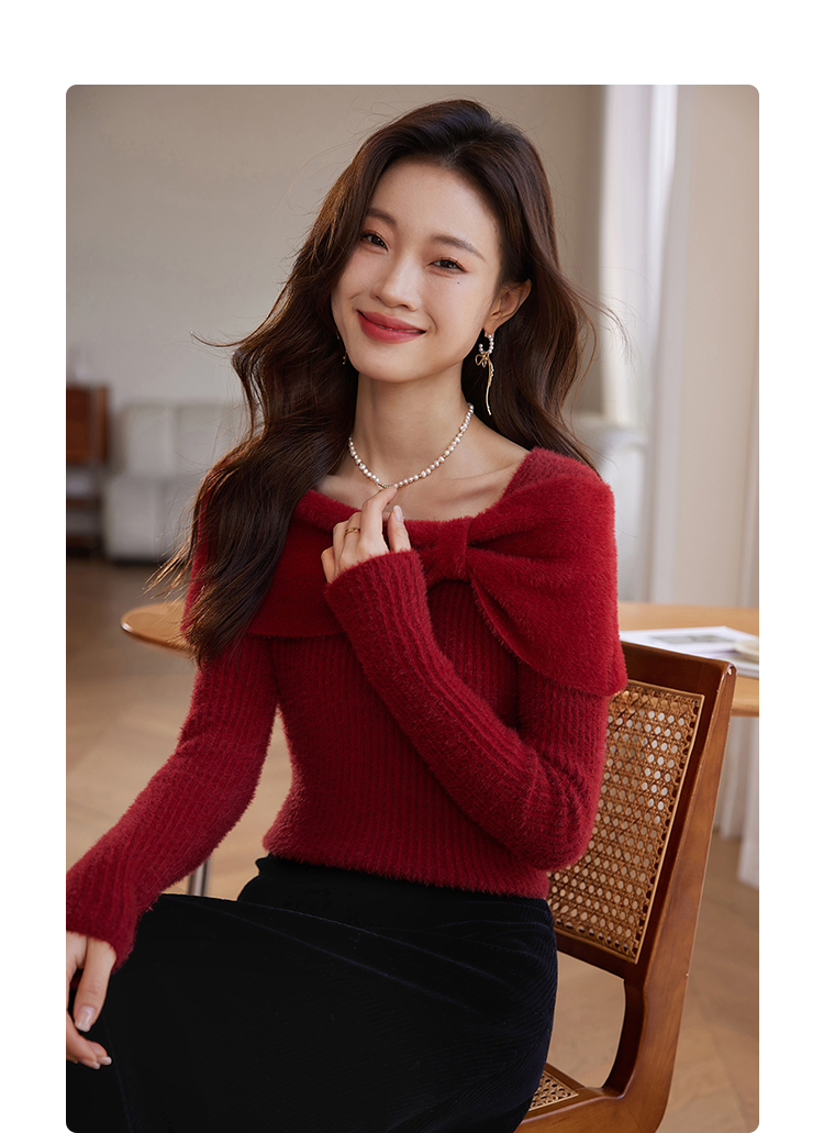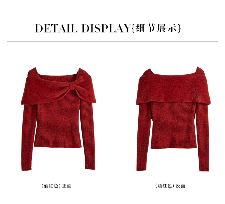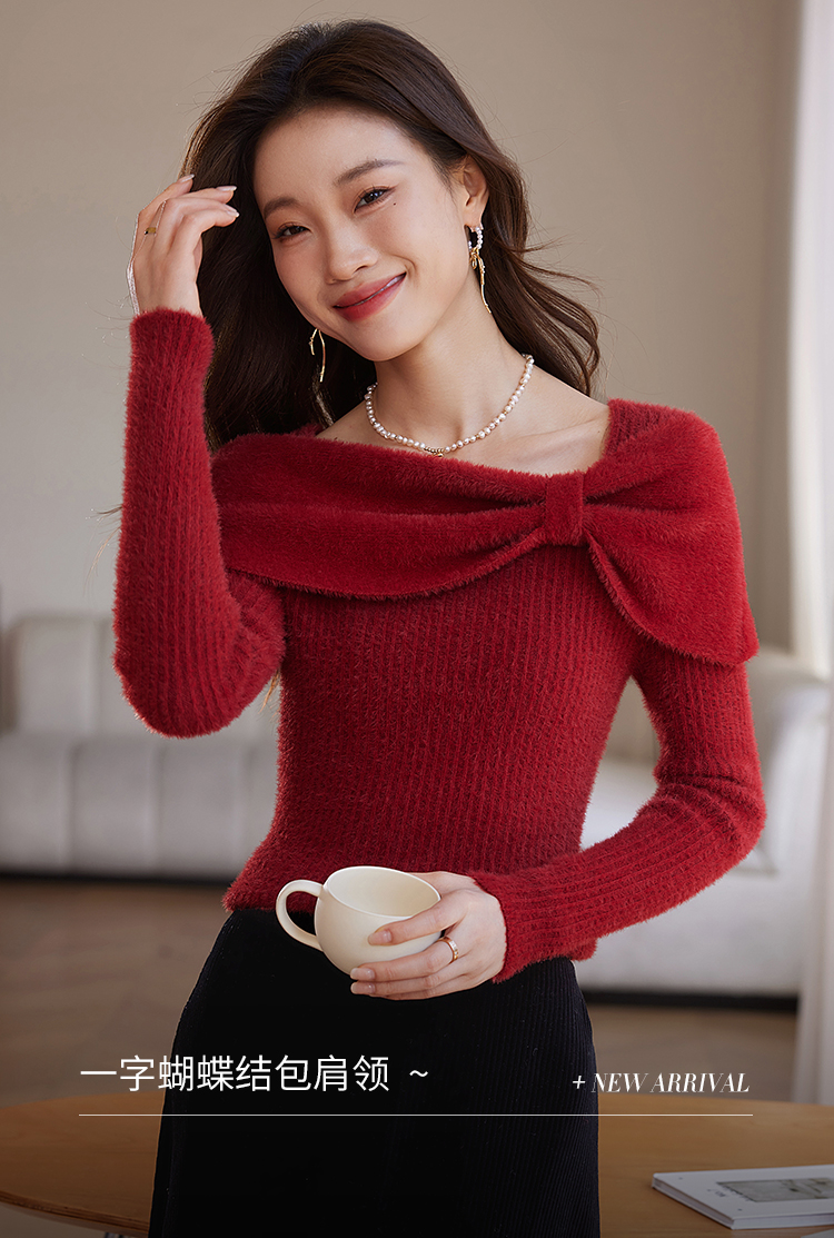 【年终特卖】熙世界蝴蝶结一字领包肩新年红色毛衣女设计感秋冬减龄打底针织衫