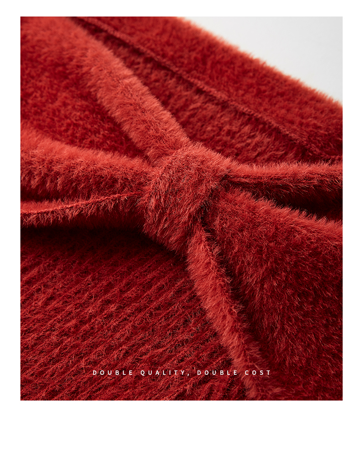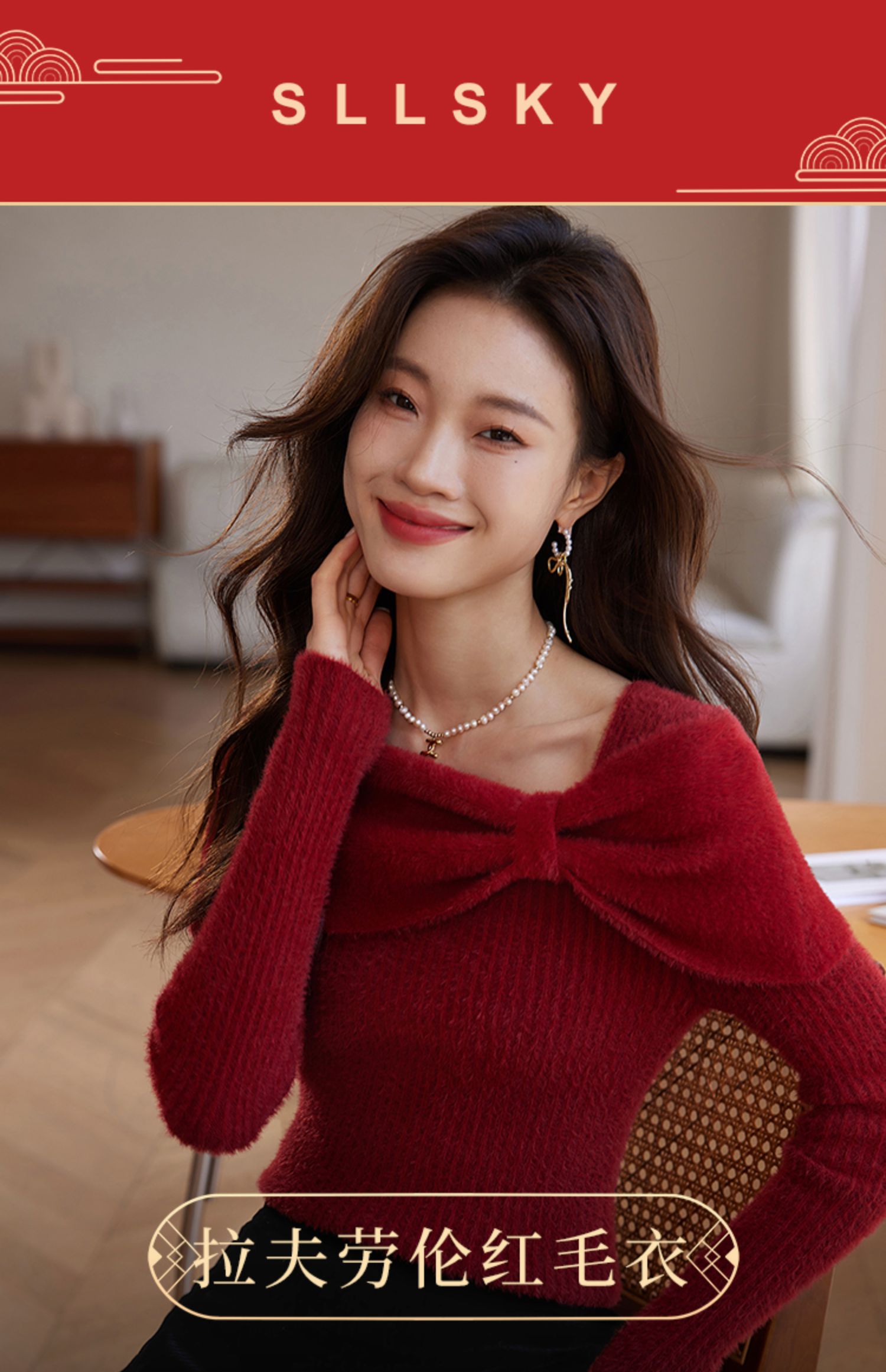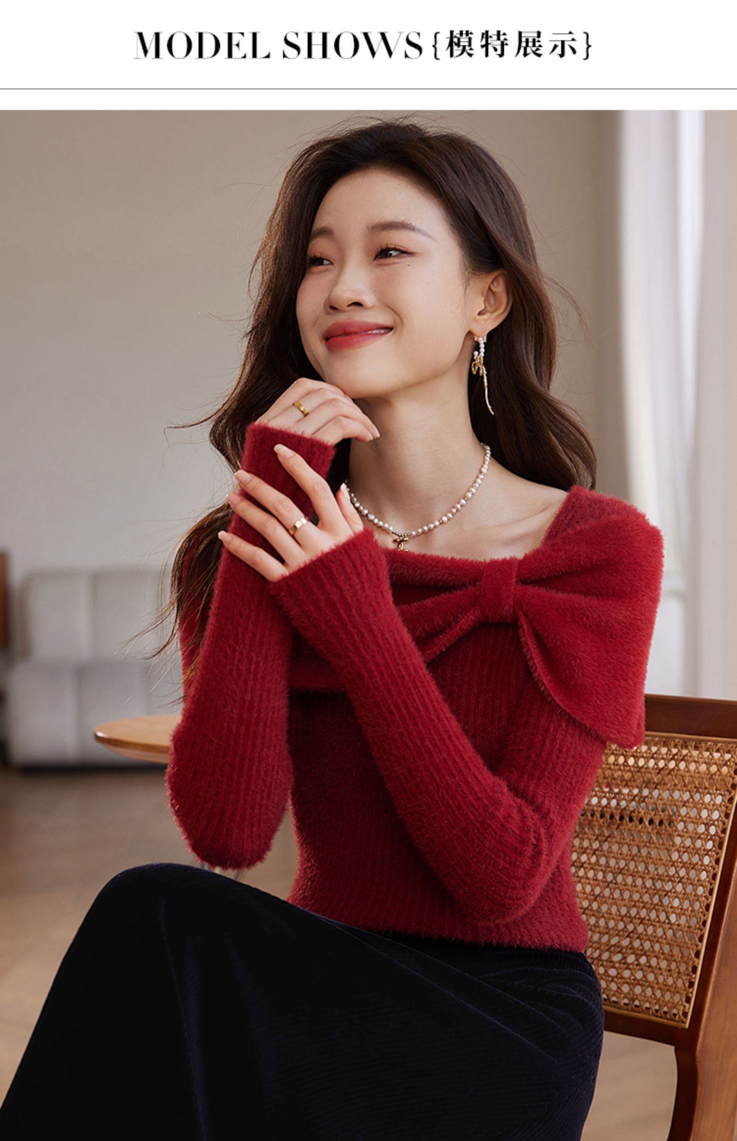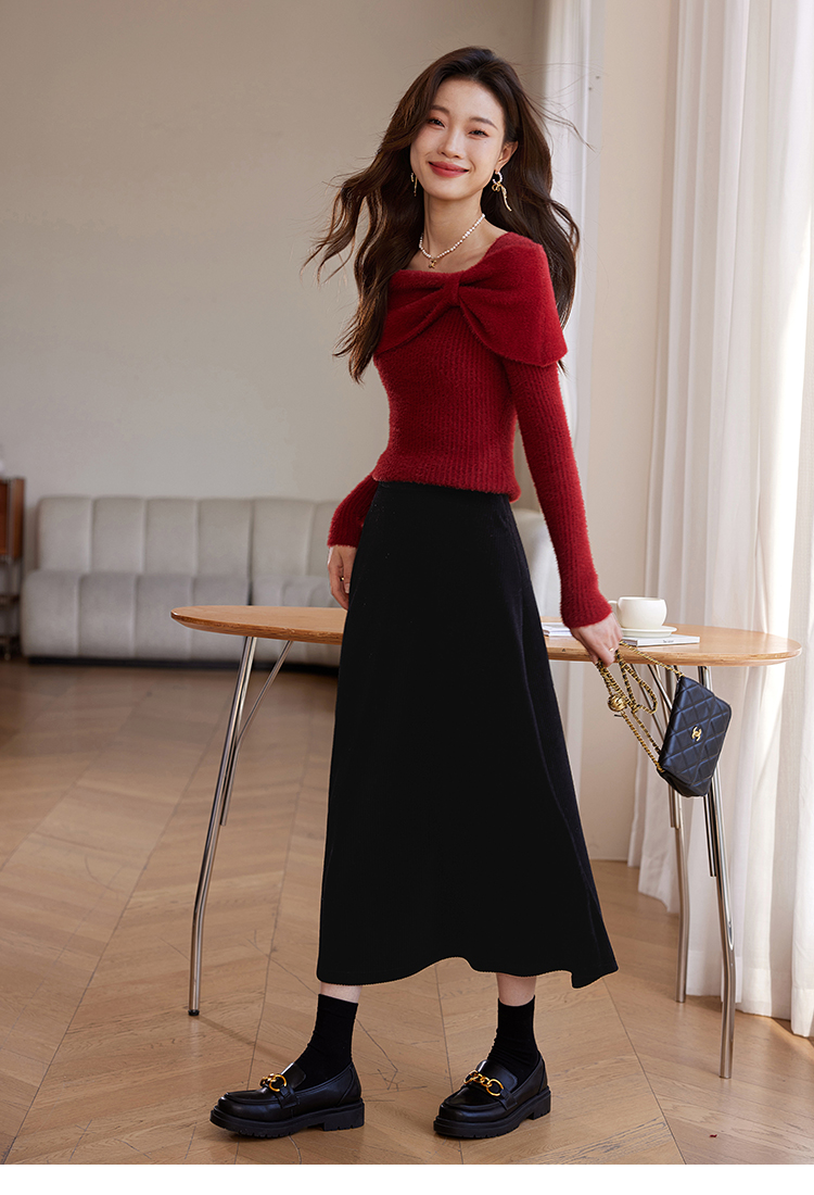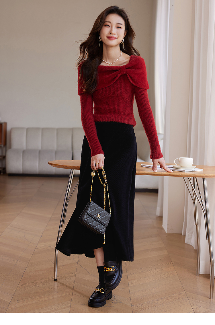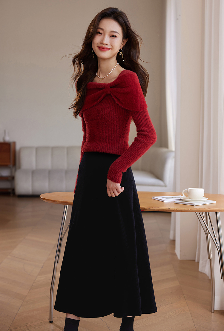 【年终特卖】熙世界蝴蝶结一字领包肩新年红色毛衣女设计感秋冬减龄打底针织衫