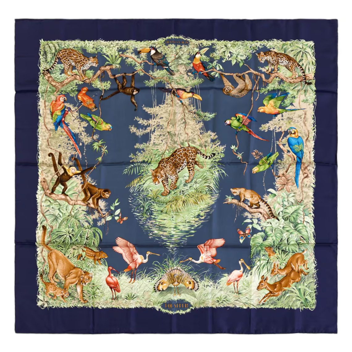 独角鹿西洋古董1988年法国爱马仕出品Robert Dallet设计《赤道》主题蓝色款丝绸方巾