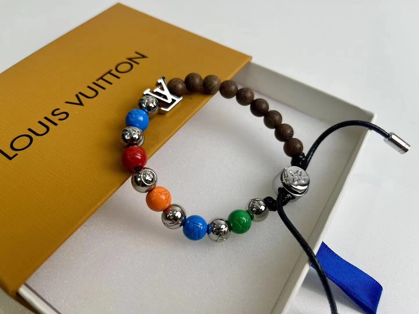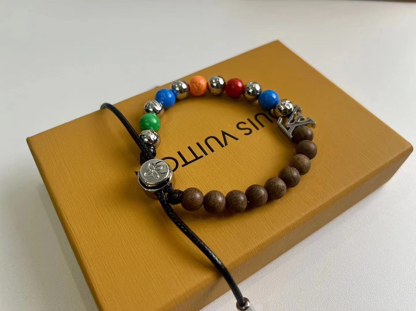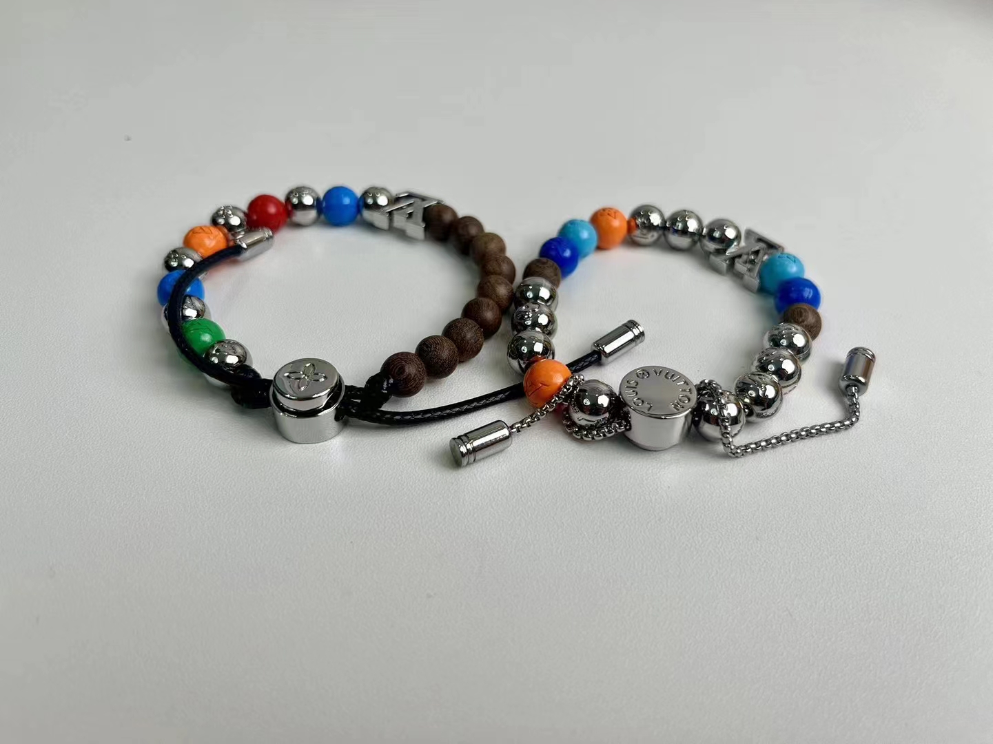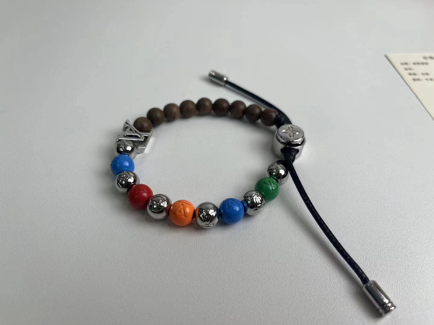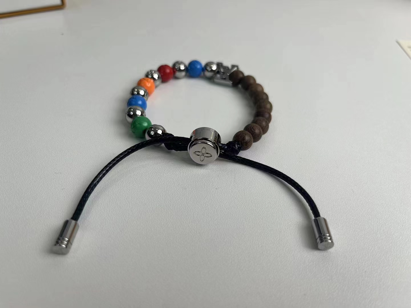 前卫时尚手链-彩虹色+桃木色+银色!新品彩虹拼接串珠,高颜值时尚潮流新款,手链以多重色彩+桃木,释放玩趣意味。字母化身挂饰和抛光金属串珠上的铭纹,树脂串珠呈现细腻亮泽。纤薄设计适宜与其他手链叠戴。详细特征:金属-树脂-镂刻字母-可调节!
