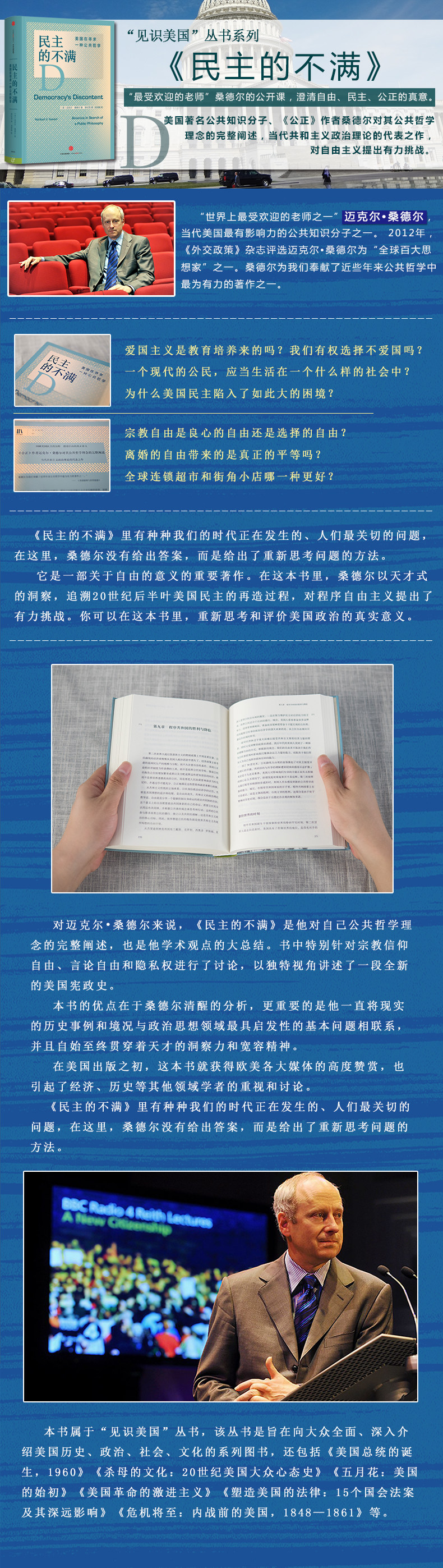 宗教自由是良心的自由还是选择的自由?离婚的自由带来的是真正的平等吗?全球连锁超市和街角小店哪一种更好?《民主的不满》里有种种我们的时代正在发生的、人们特别关切的问题,在这里,桑德尔没有给出答案,而是给出了重新思考问题的方法。