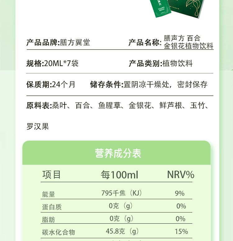 活动-膳方翼堂膳声方百合金银花植物饮料140ml(20ml*7袋)/盒