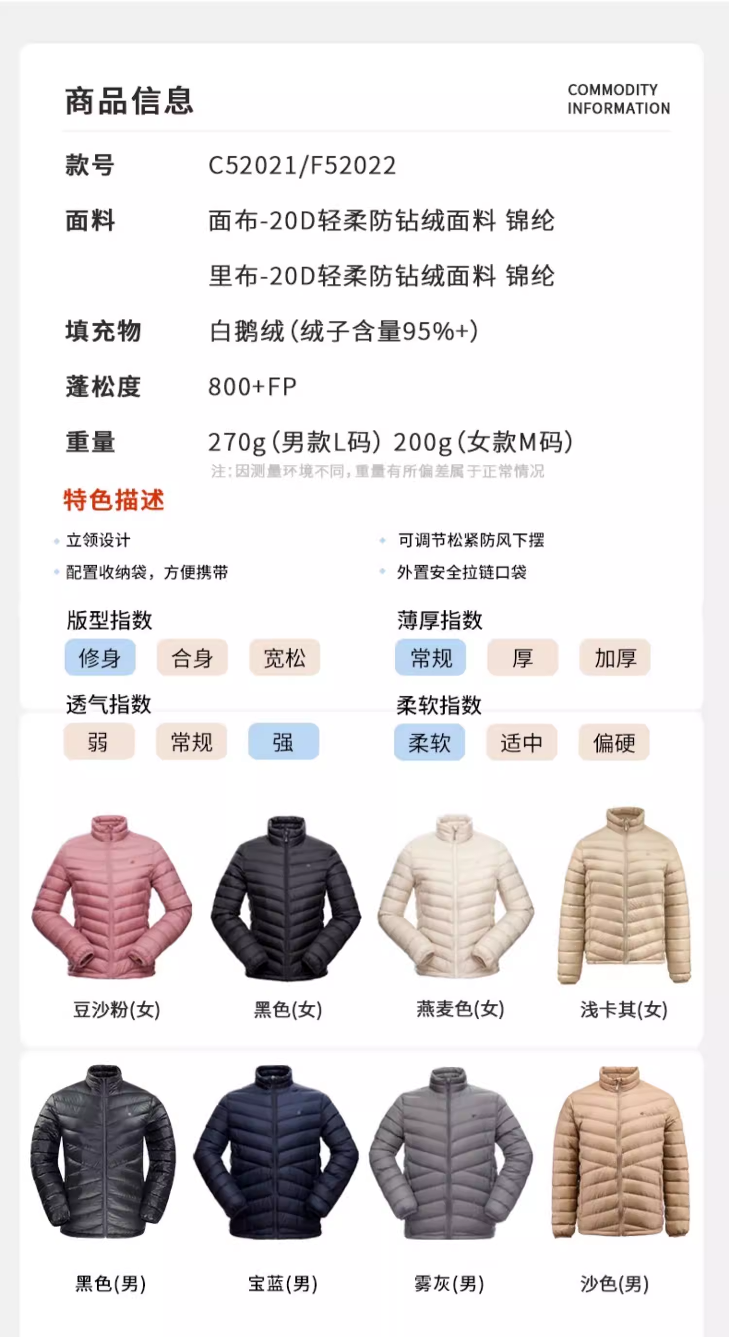 君羽户外反季羽绒服男女款90鹅绒800蓬秋冬轻薄时尚短款C52021/F52022