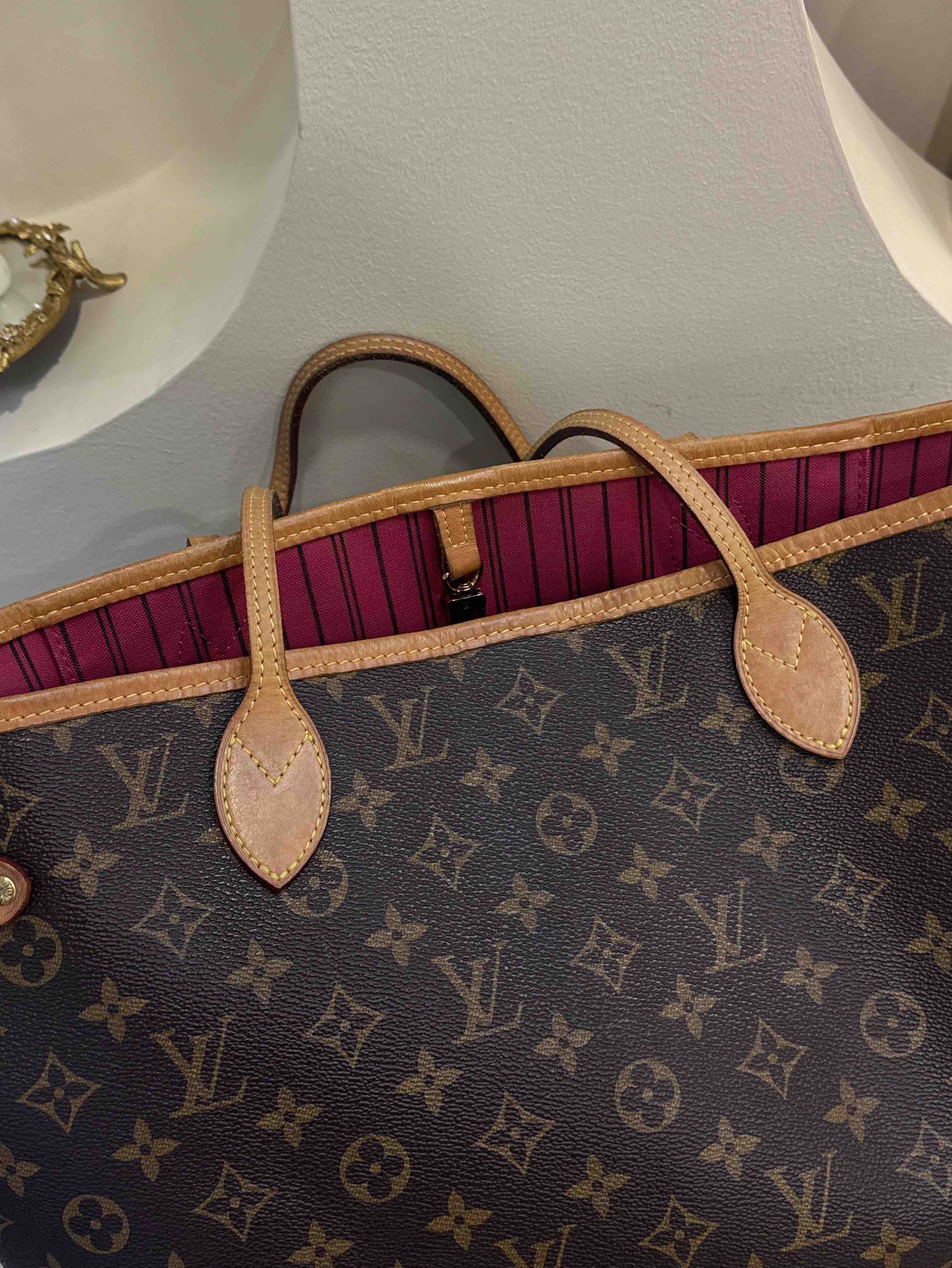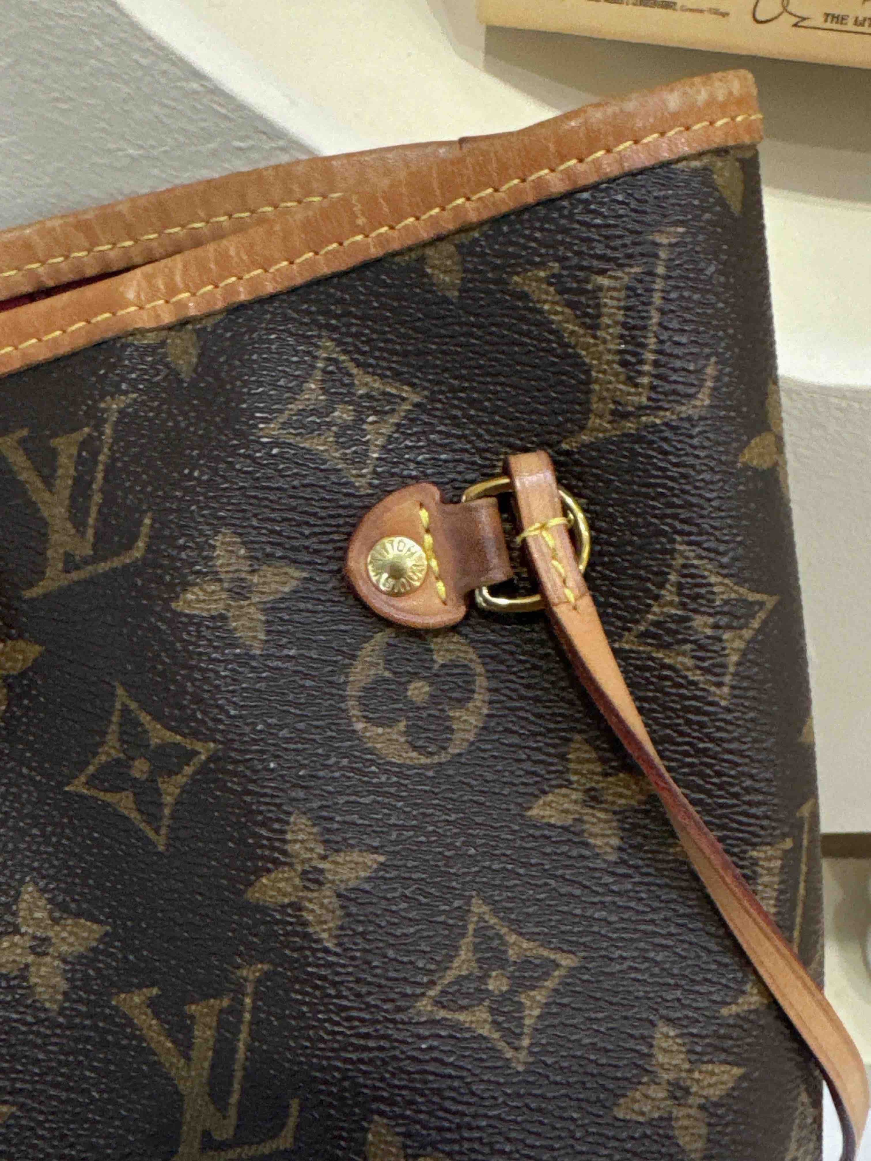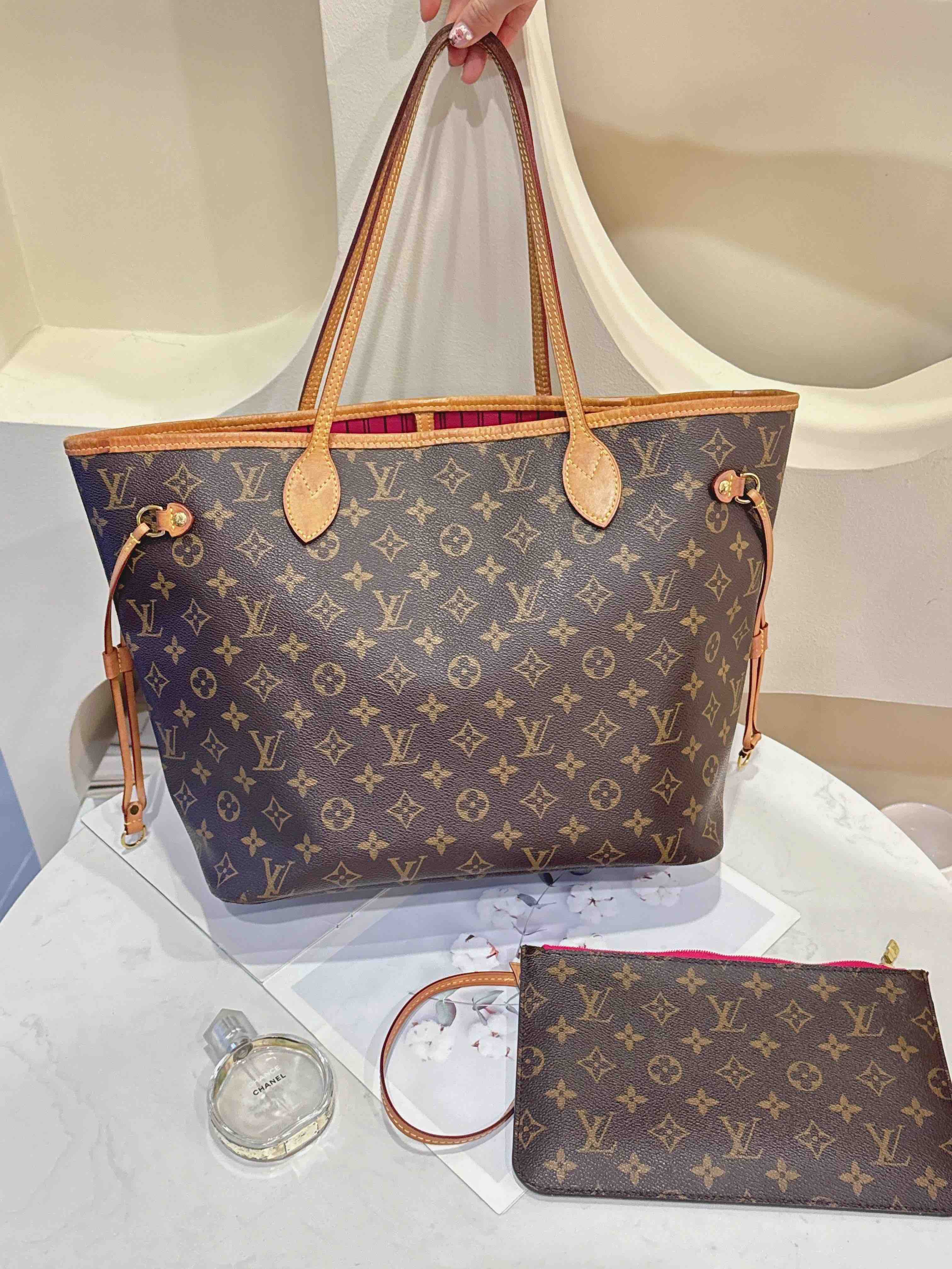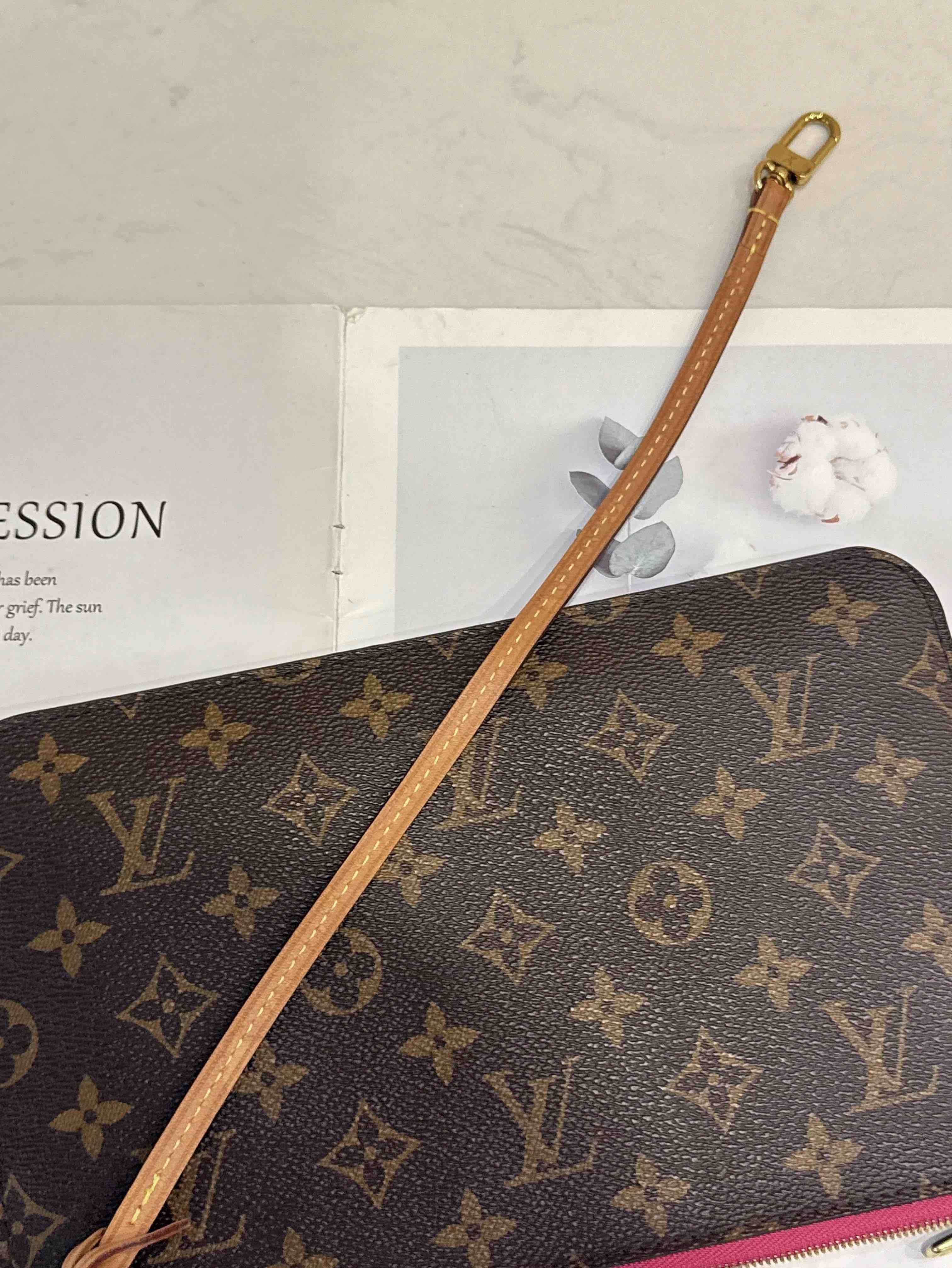 【商品詳情】正品二手 LV neverfull 中号 老花 粉条纹内衬 单肩包😎 93新 32*19 配件:子袋。植鞣革和一处边角正常使用感。装得下全世界
