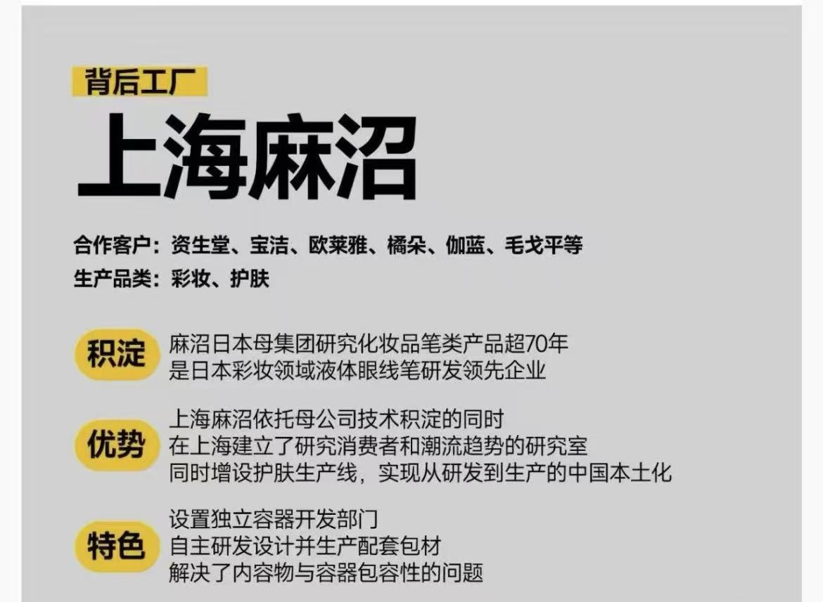 麻沼工厂介绍:从一只眉笔开始,经营70多年的彩妆OEM麻沼集团,在上海也有一家子公司,就在猪猪家附近。跟国内外知名品牌有合作,比如毛戈平、伽蓝、Dior、TOM FORD、Pola、兰蔻、倩碧、雅诗兰黛、资生堂、欧莱雅等!