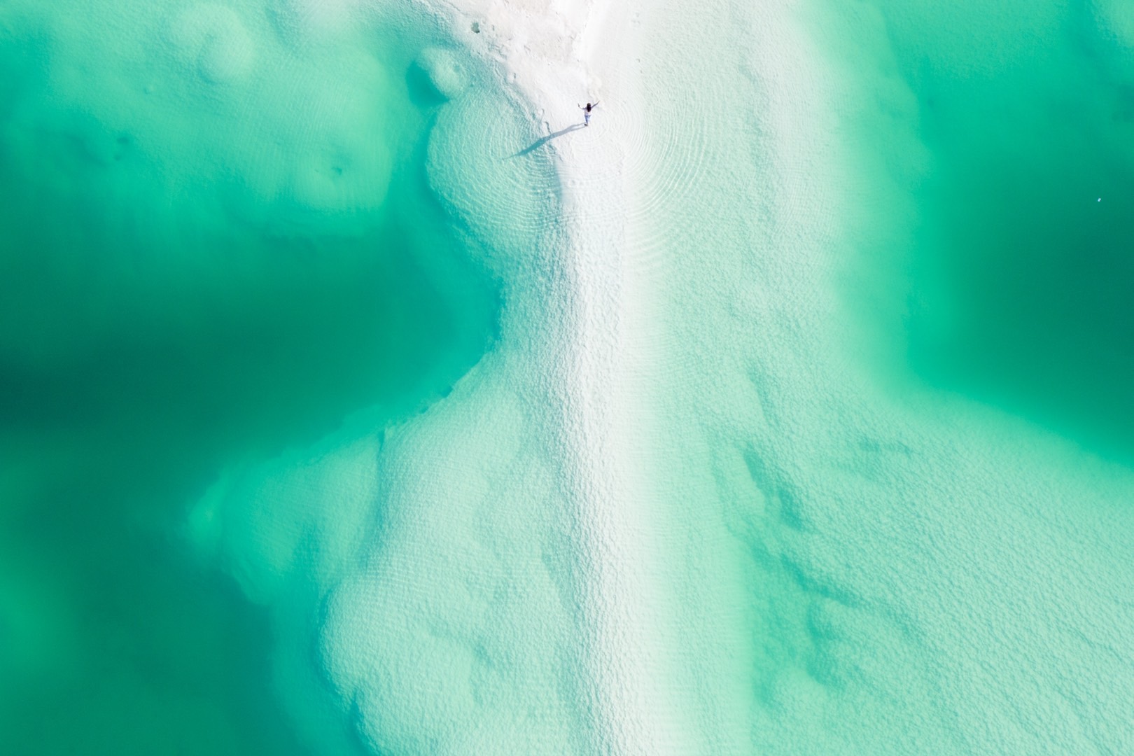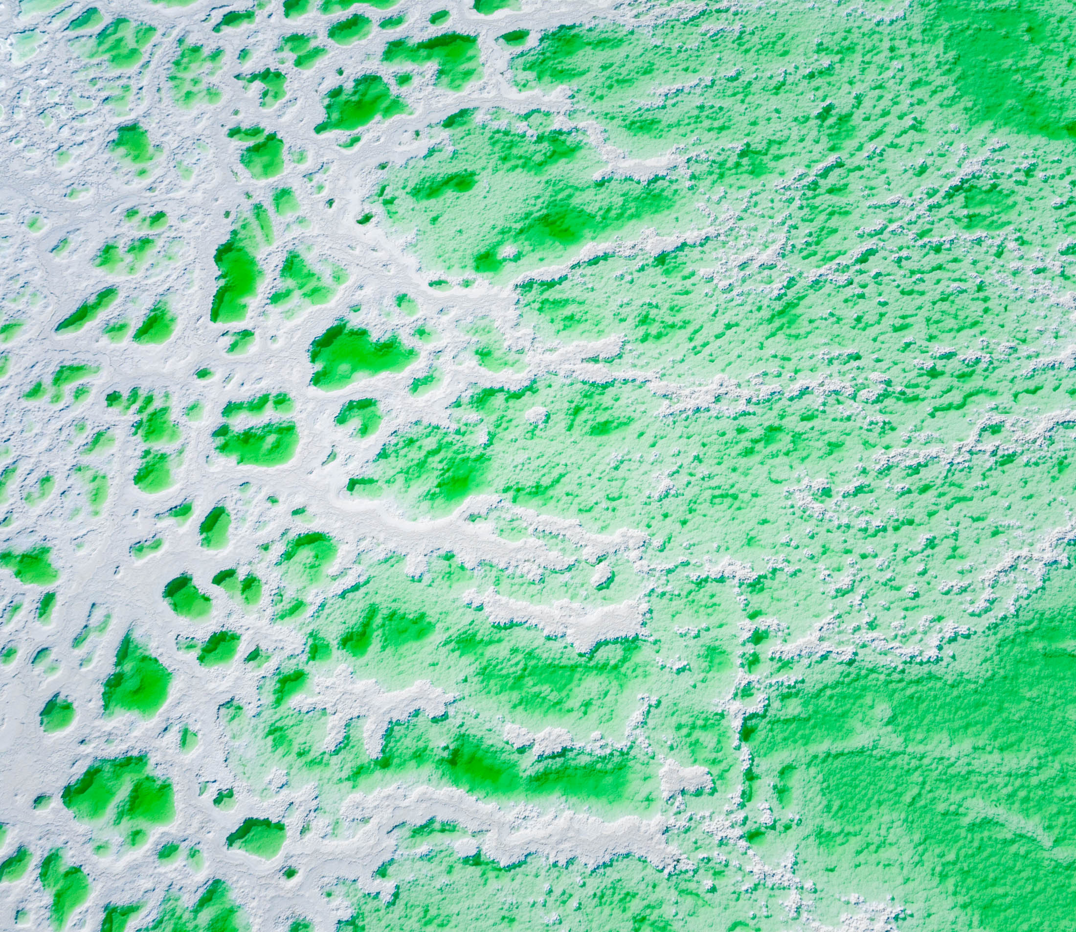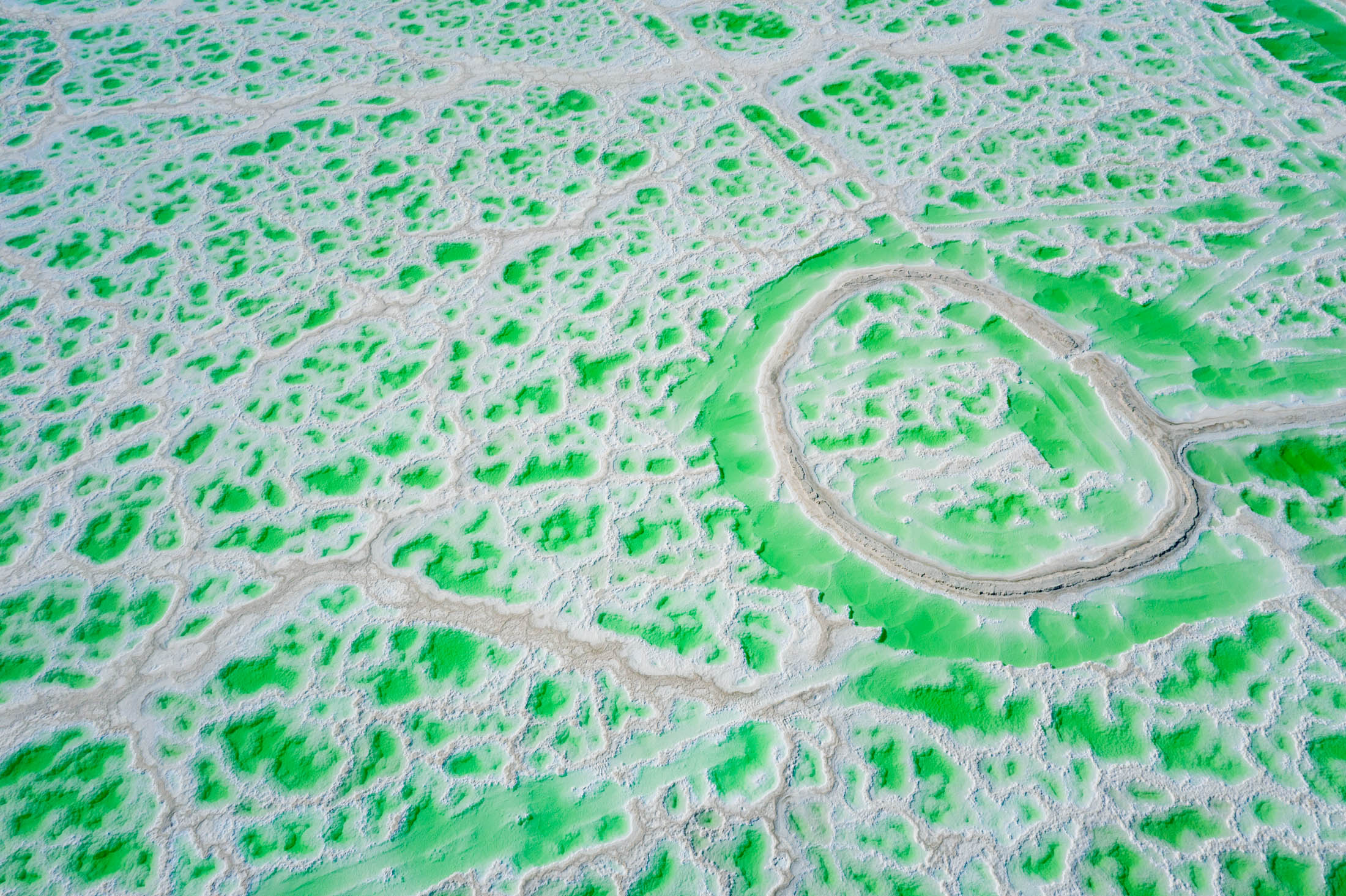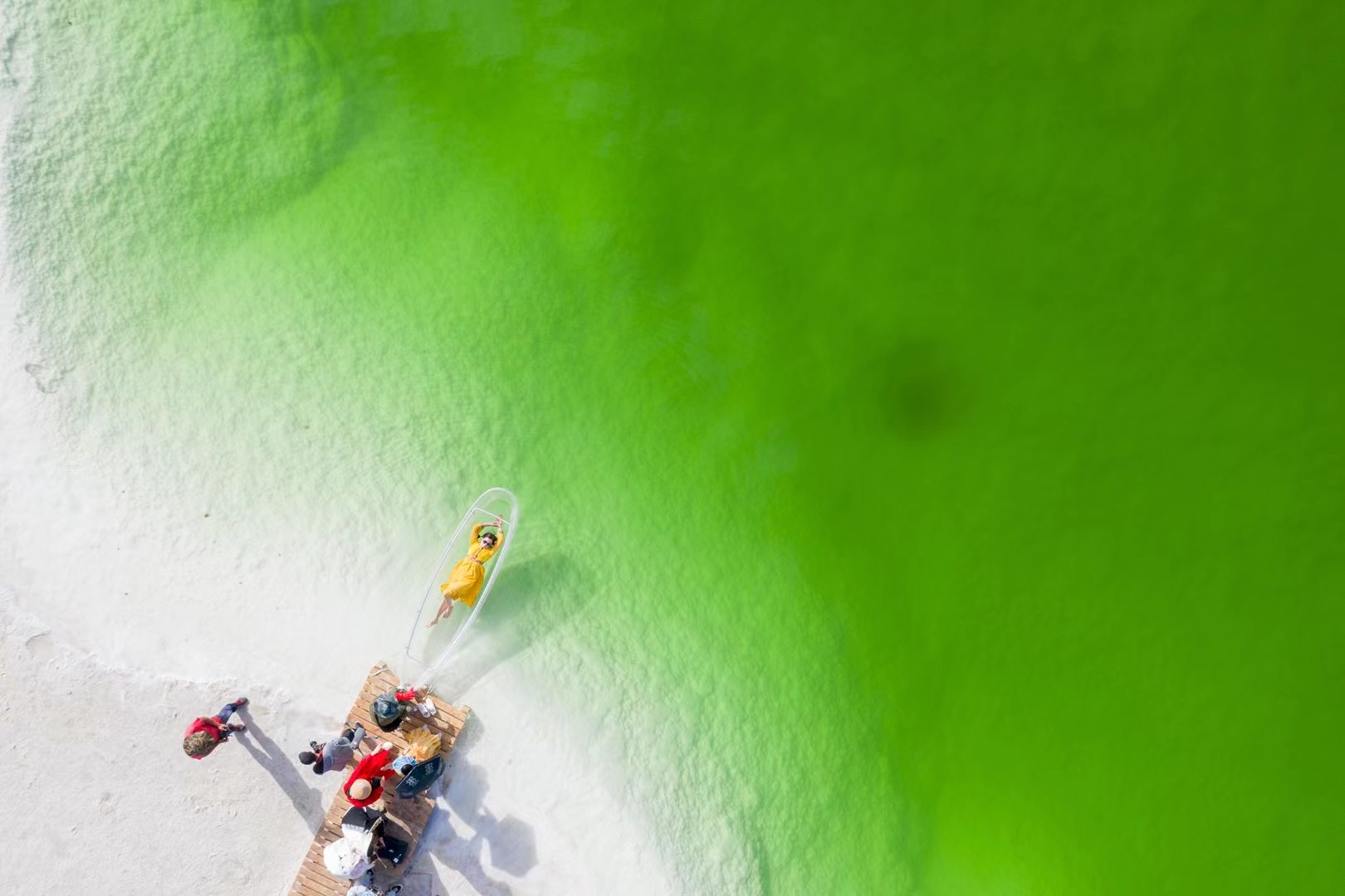 盐湖地貌:湖周围是白色的盐结晶,与翠绿的湖水形成鲜明对比,景色十分梦幻。