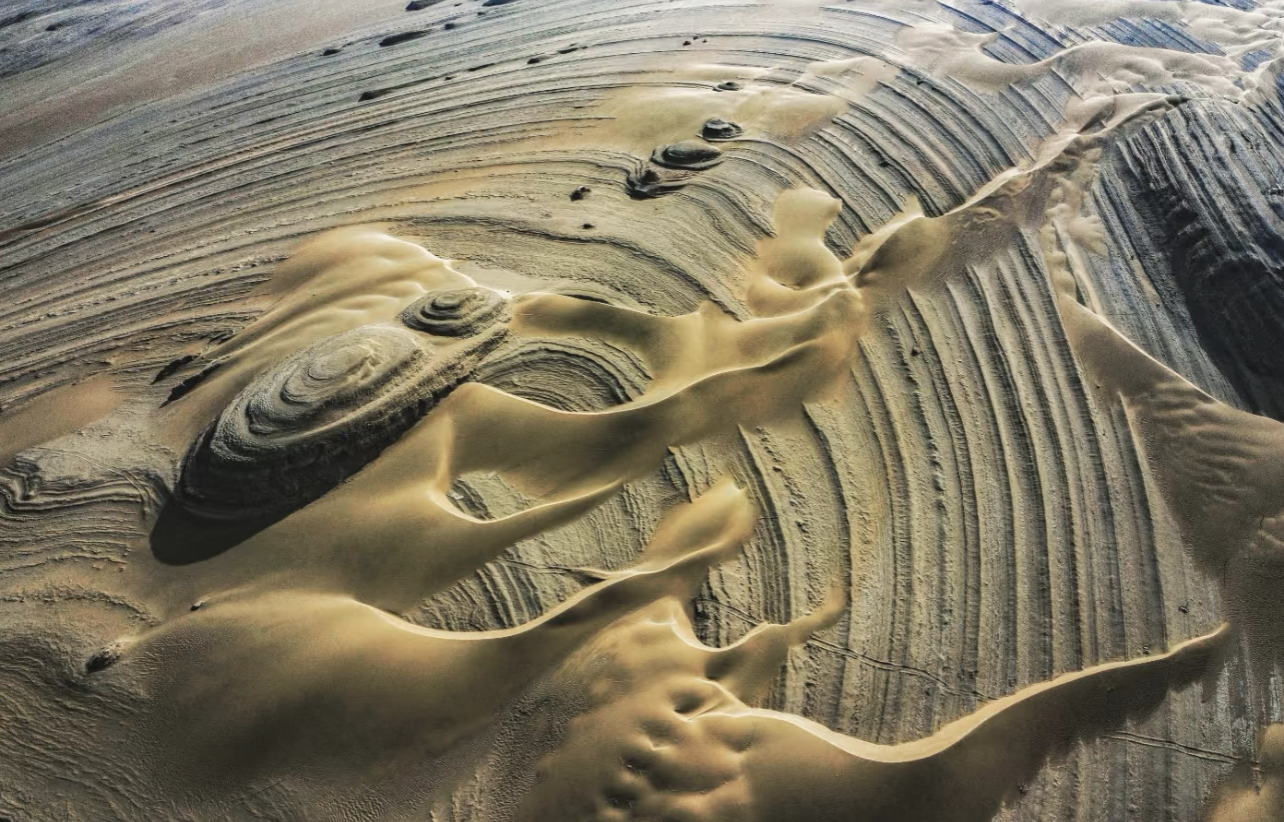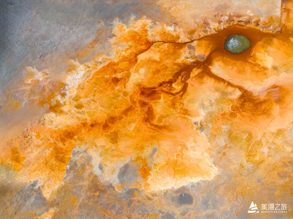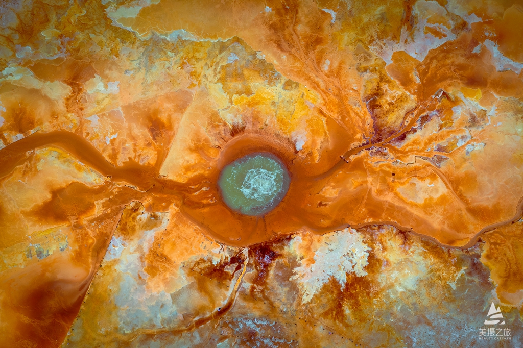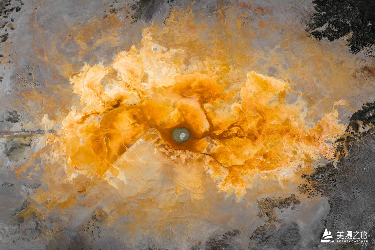 下午:艾肯泉日落,红褐色、黄色等色彩斑斓的地貌,与周围的戈壁滩形成鲜明对比。从高空俯瞰,宛如一只巨大的眼睛。