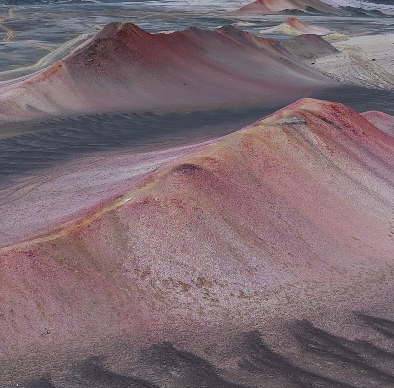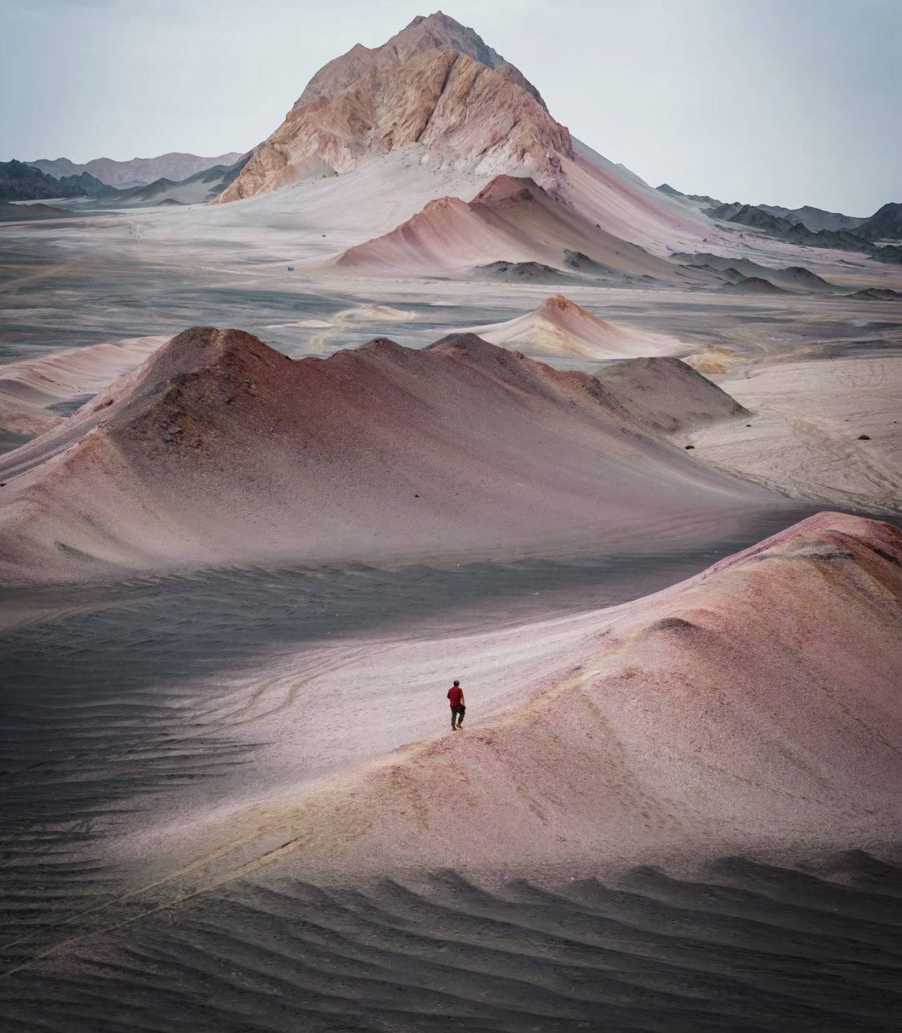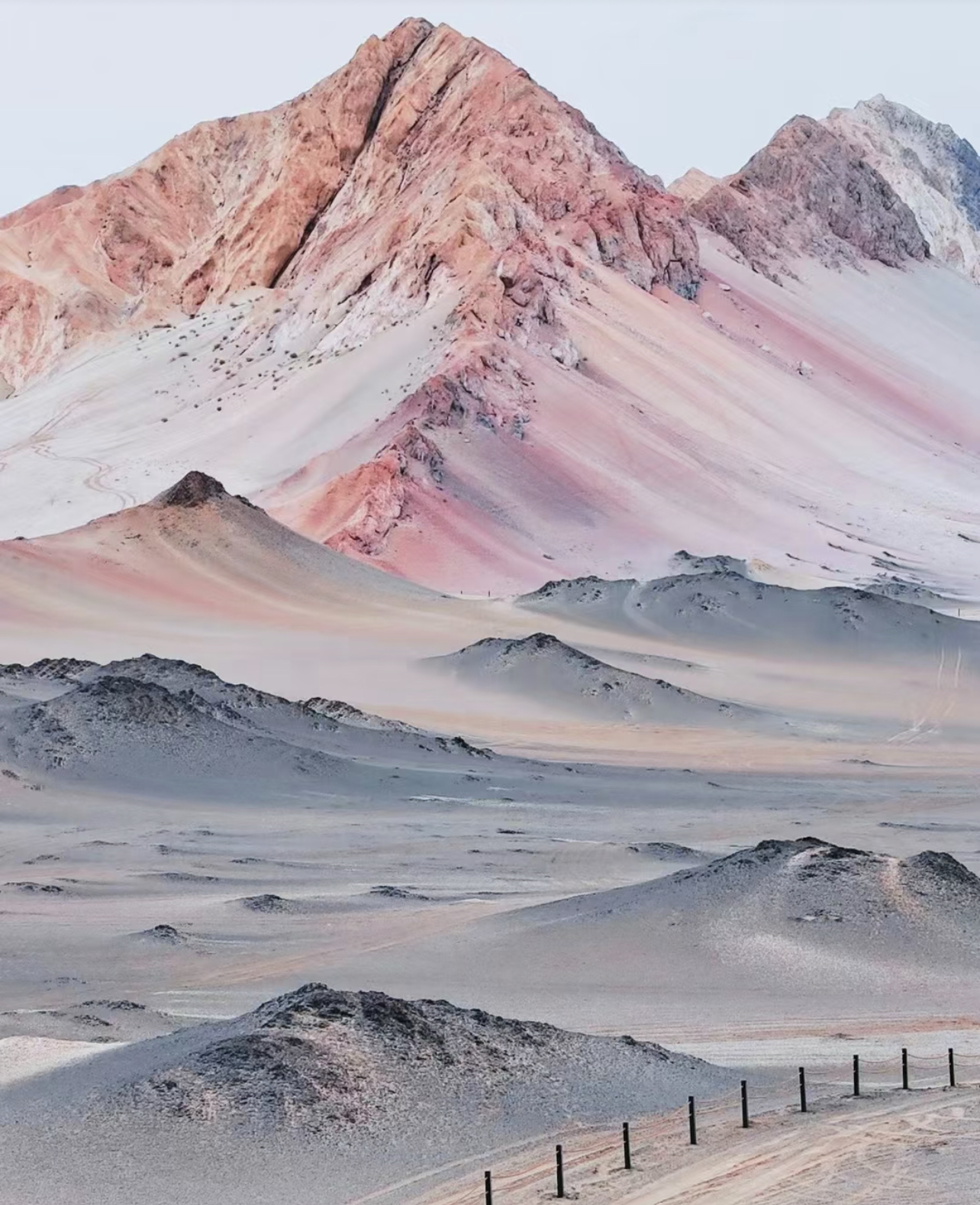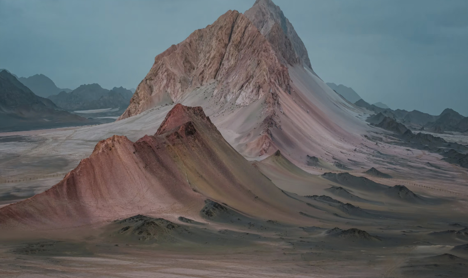 由于风积作用,这里浅色的灰白色戈壁与黑色、淡红色的岩石相互交错,形成强烈的色差对比。七彩流沙与黑独山的景象相得益彰,视觉冲击力十足。