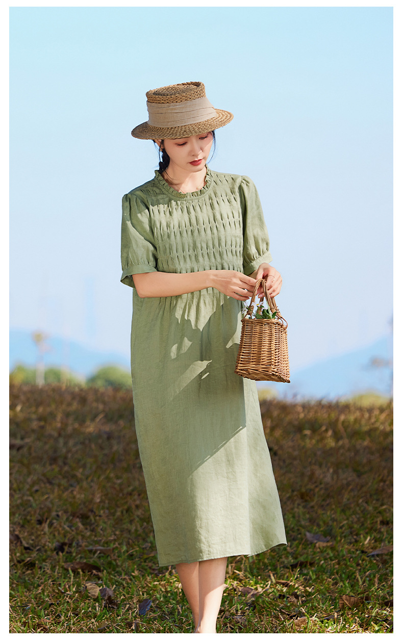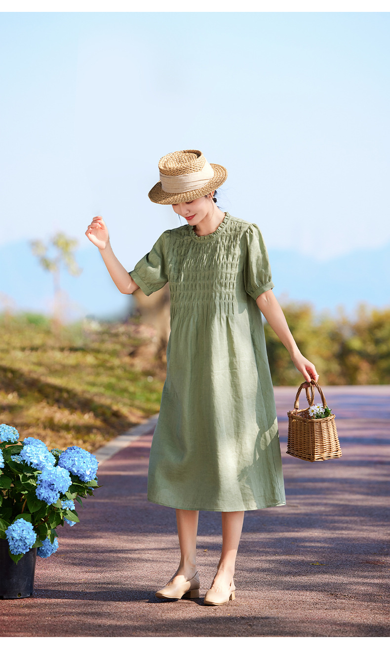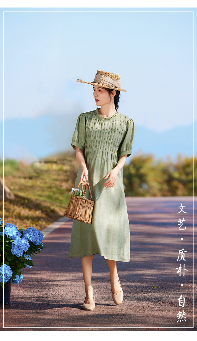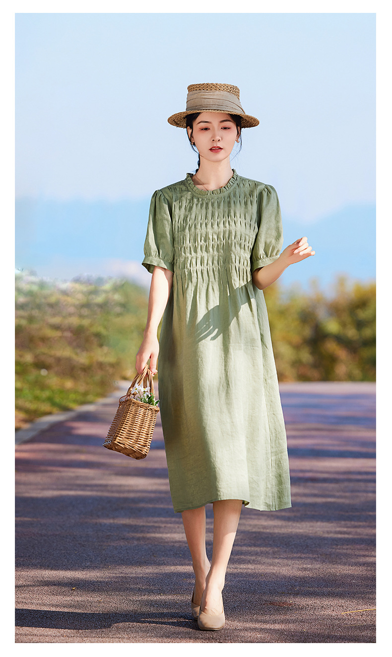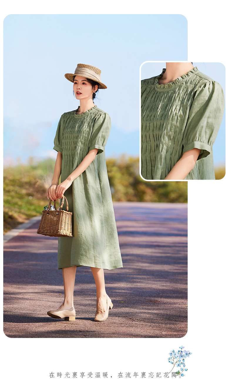 HM-S437春夏新款高端亚麻连衣裙中袖圆领木耳边温柔风琴褶文艺A字裙