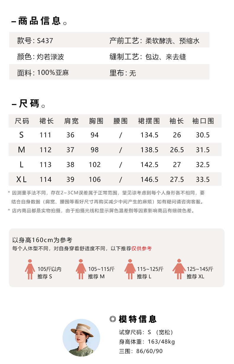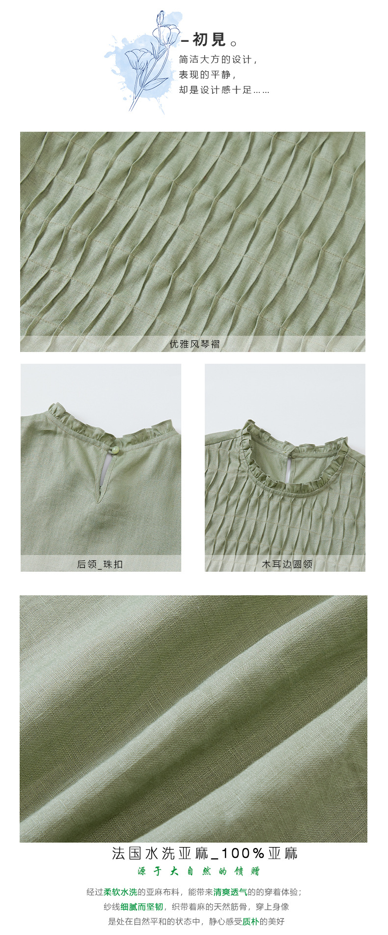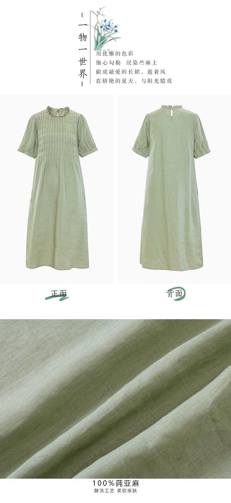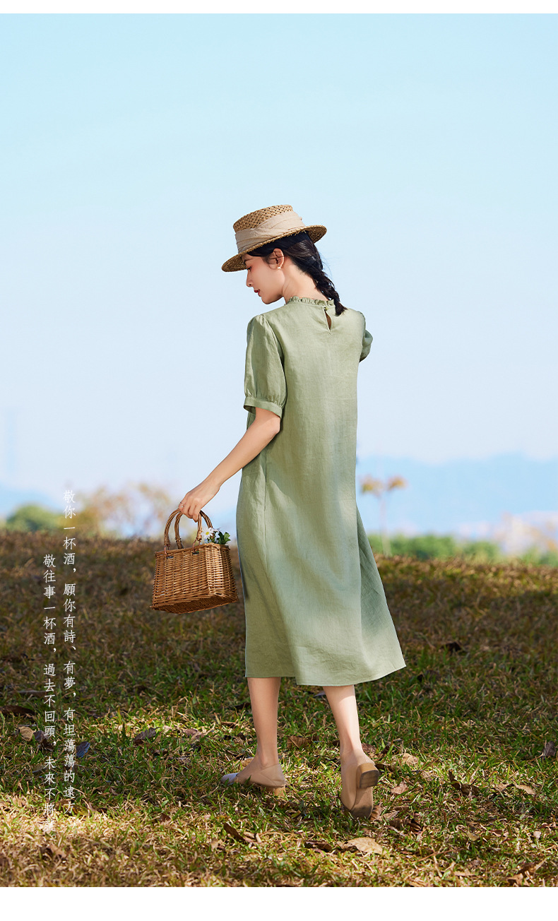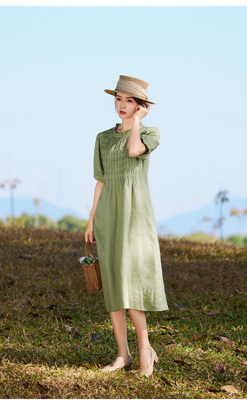 HM-S437春夏新款高端亚麻连衣裙中袖圆领木耳边温柔风琴褶文艺A字裙