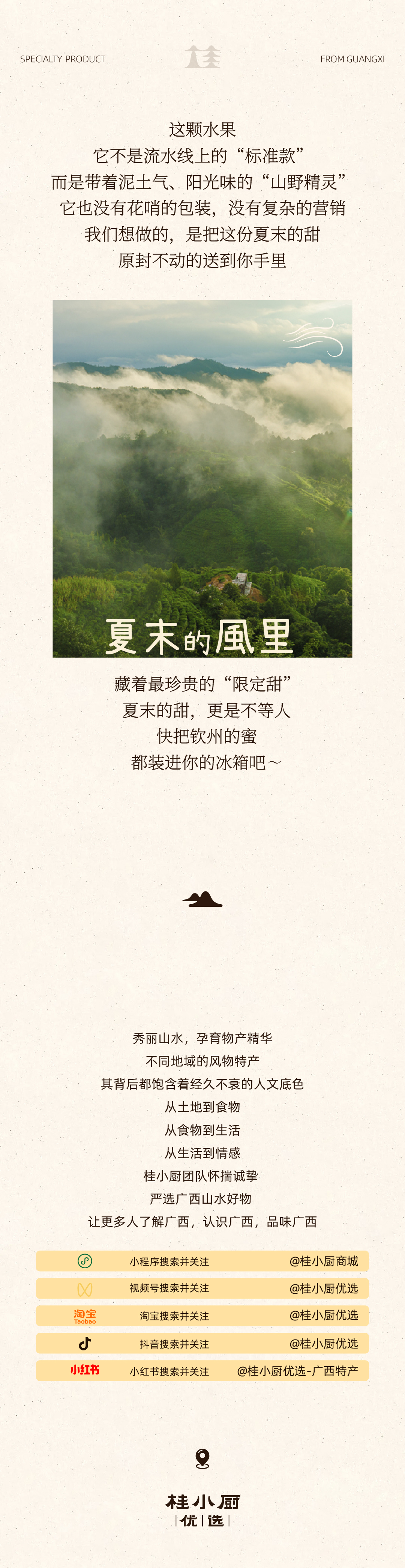 - 秀丽山水,孕育物产精华 桂小厨怀揣诚挚,走遍八桂大地 严选广西山水中土生土长的好食材 以民间传统手工艺 用心制成一份份广西好礼 自享用、送亲友两相宜