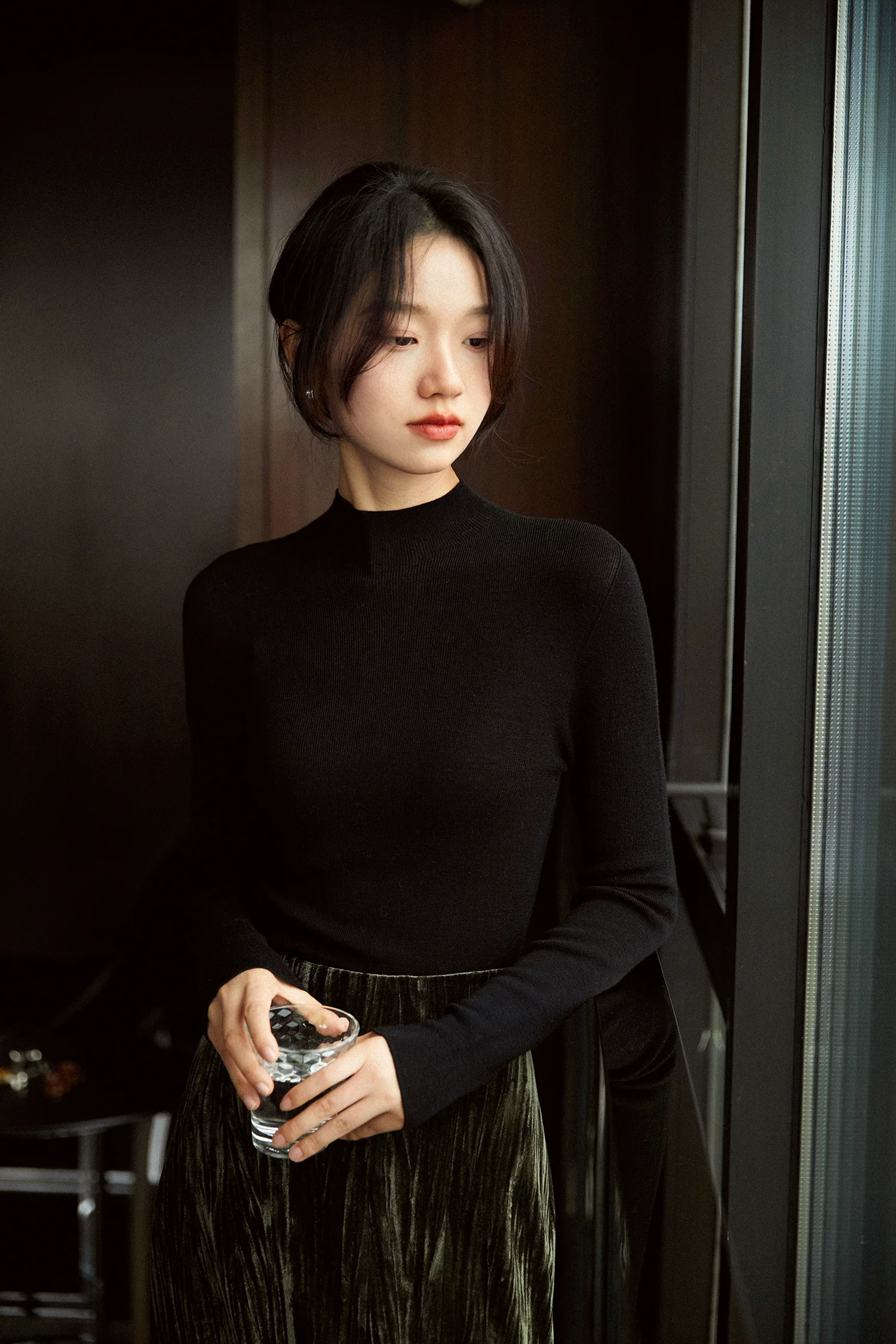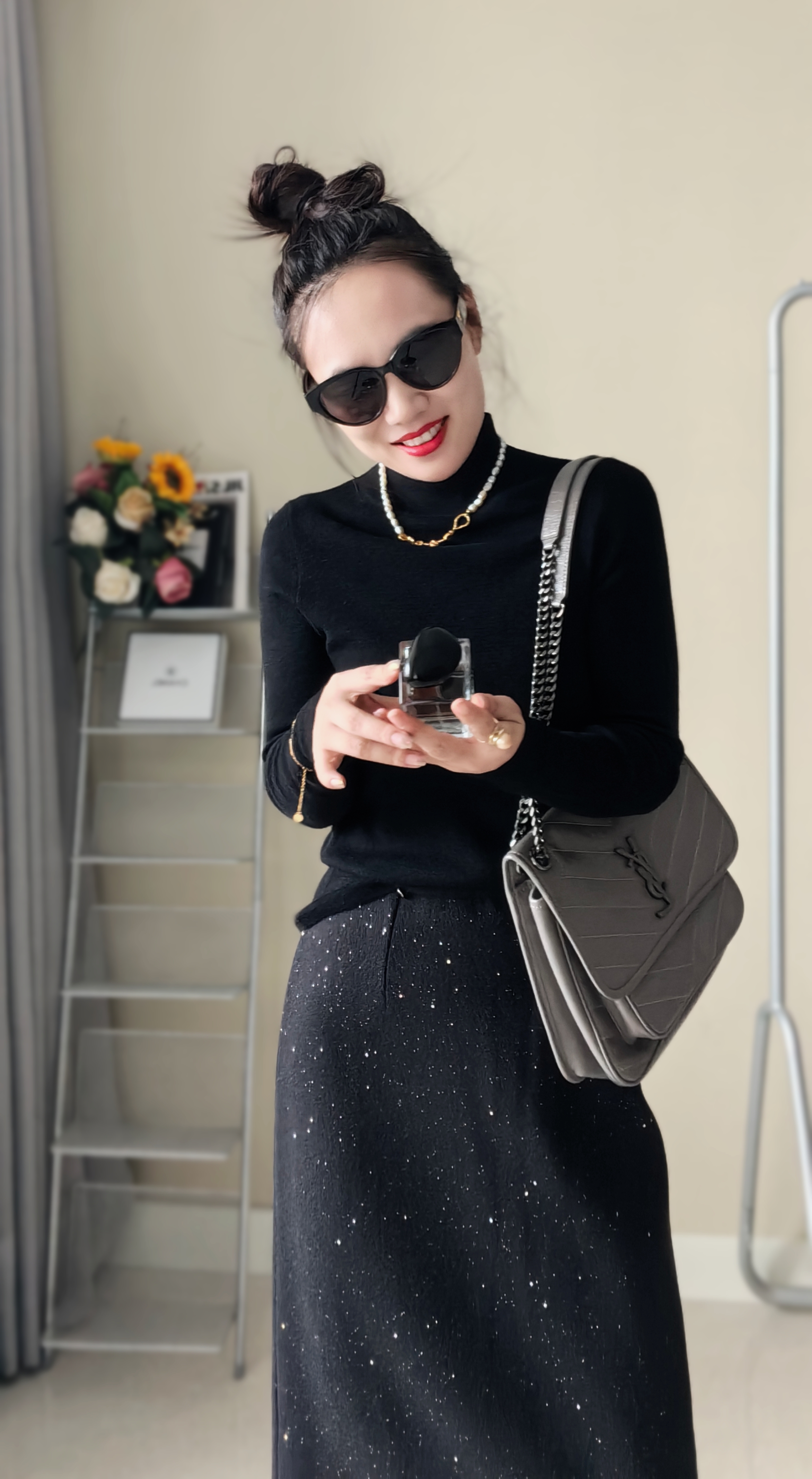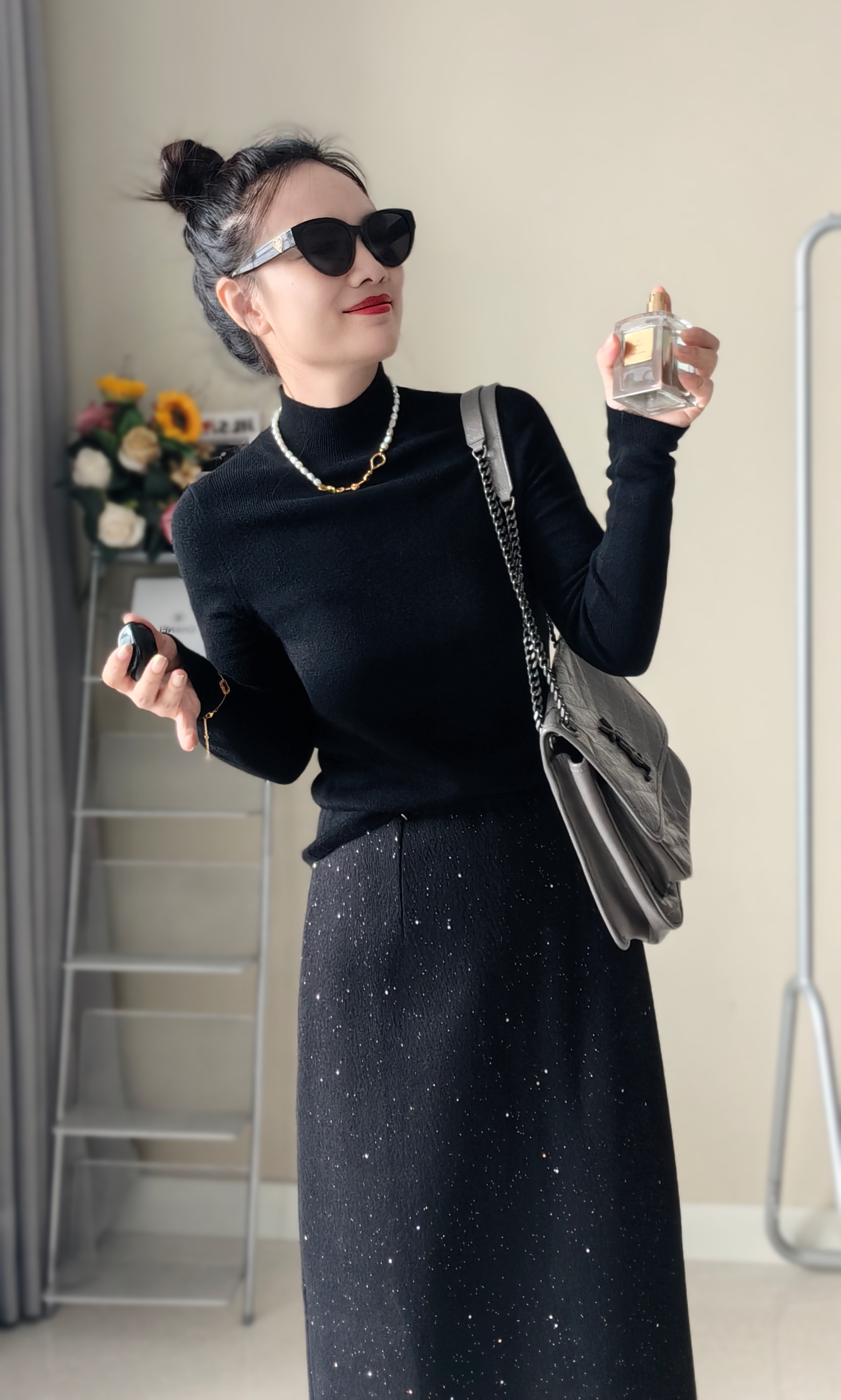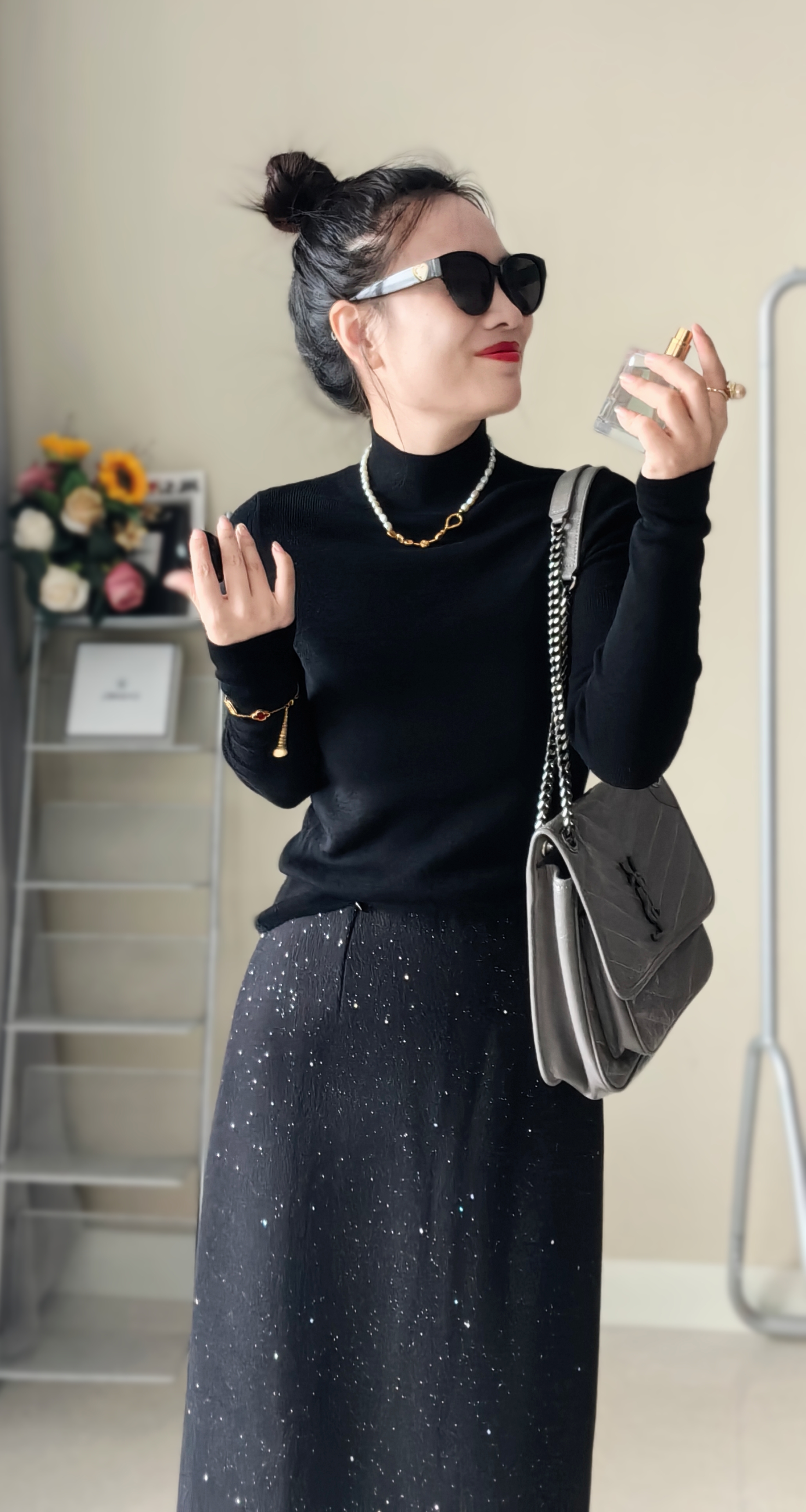 黑色羊毛衫是衣橱常青款,很喜欢半高领的高度