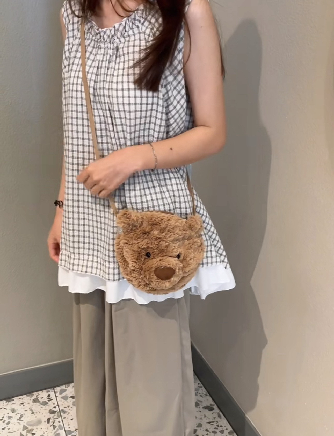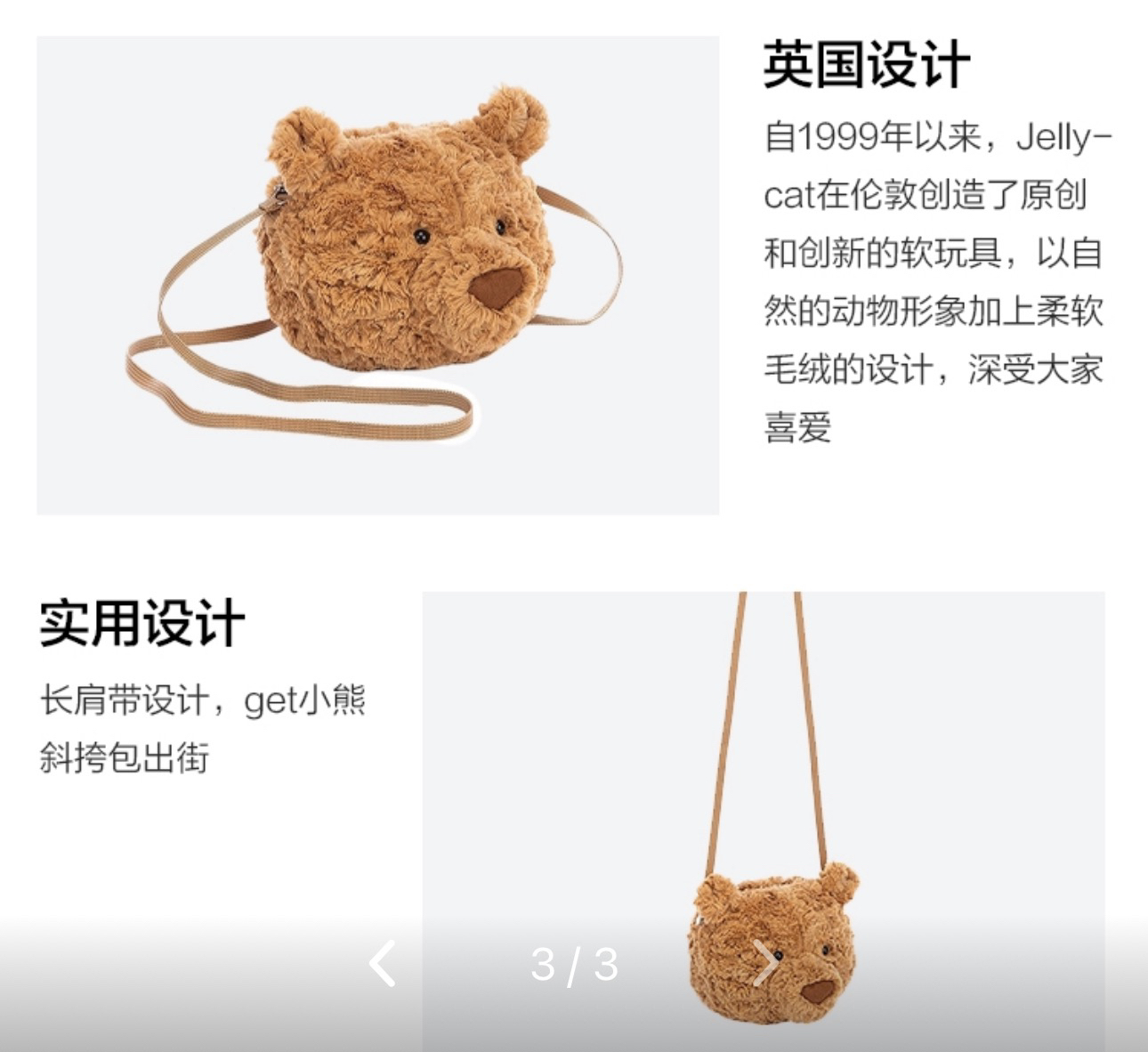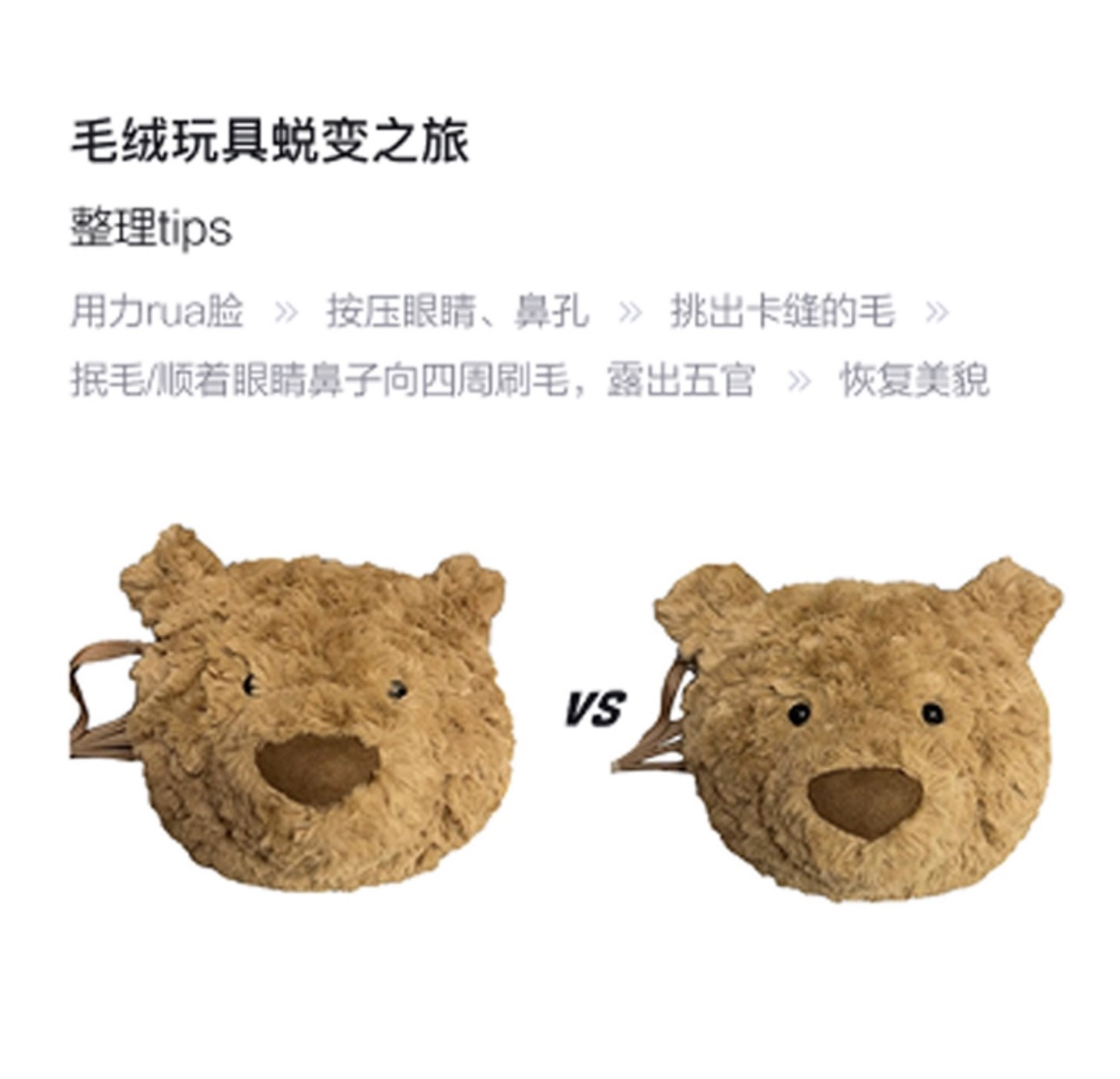 采用高品质的绒毛和填充物制作,轻盈不勒肩 几乎无任何负担,手感软糯舒适 满满的治愈感!高品质不易掉毛变形,经典的萌宠形象搭配腼腆羞涩的表情,憨态活泼超可爱!立体精致的五官设计 一秒成为穿搭的亮点,上身减龄甜美,搭配裙装裤装都毫无违和感,小朋友背也合适,出行通勤 逛街或拍照出片皆可轻松驾驭~不啰嗦 喜欢的闭眼入吧!