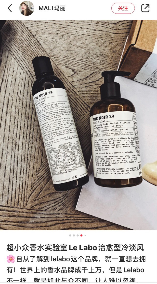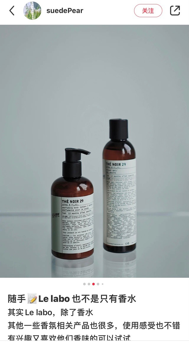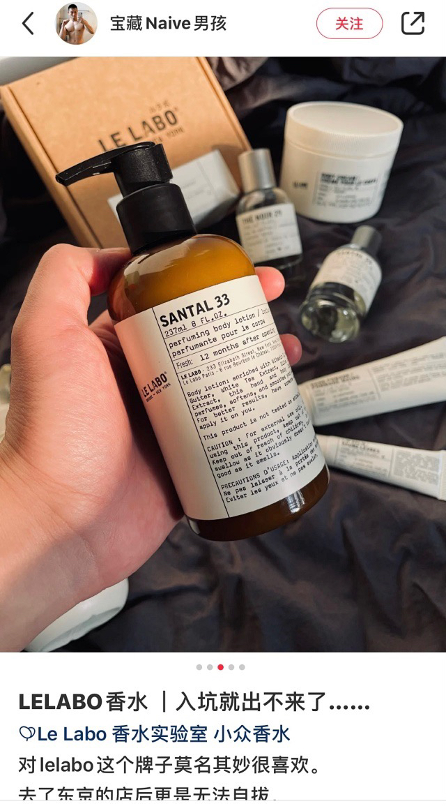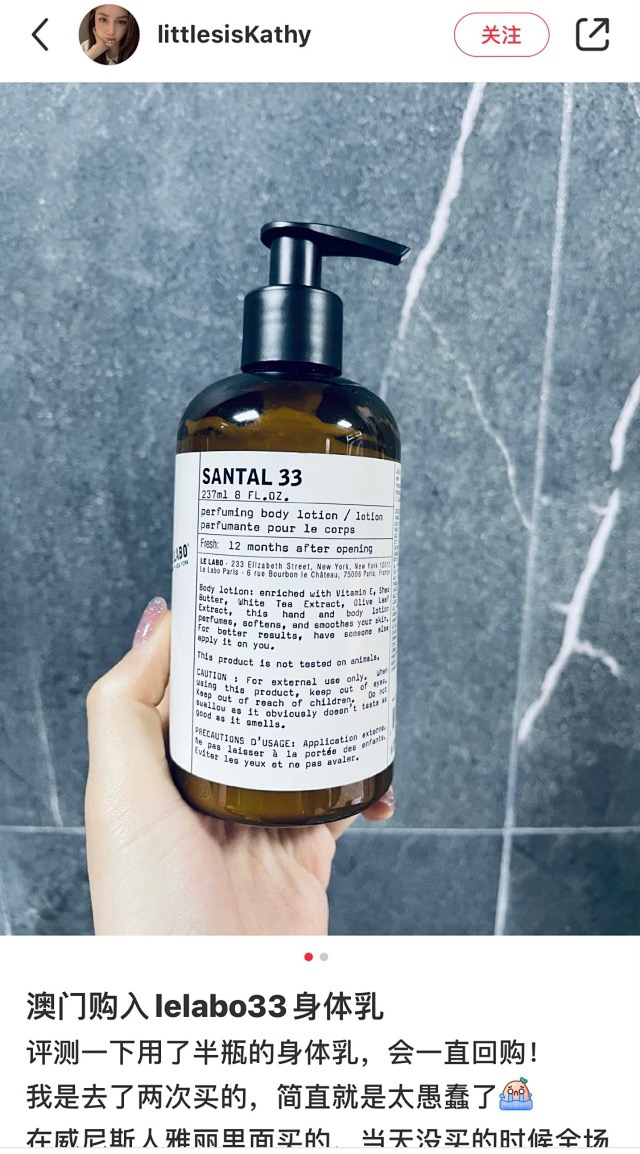 简约包装 具有品牌影响力 身体乳的质地柔软 延展性特别好 涂完不粘皮肤 不过它没有那么滋润 不适合干到起皮的皮肤 它的按压式瓶盖用起来也很方便 卫生 当LE LABO香水变成身体乳 还可以涂满全身的感觉真的太美好了~