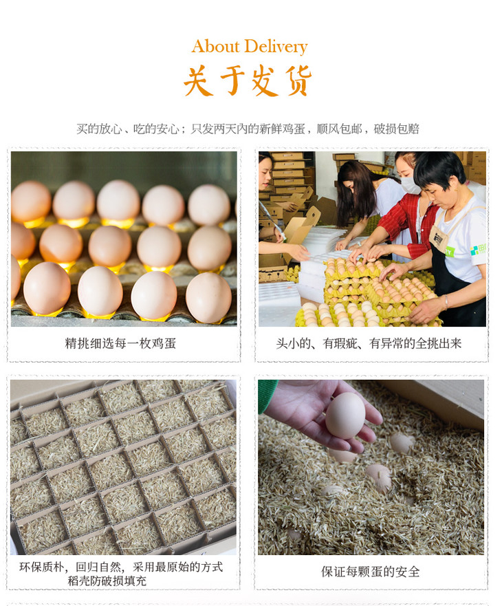 每日13:30截单,24-48小时发货。所发鸡蛋均为两天内新鲜鸡蛋,因筛选严格,可能会有所延迟,敬请谅解。