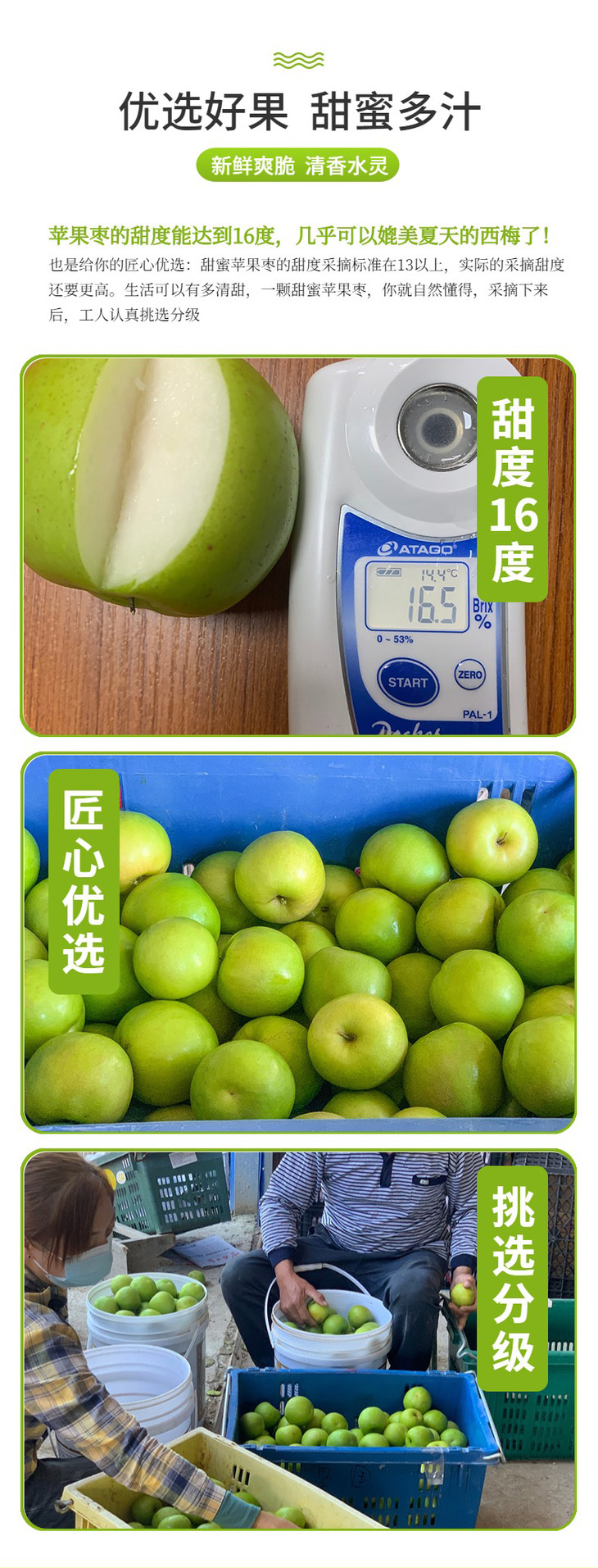 【产品说明】枣子果树上带刺,果子生长过程中,由于风吹过,果子摇摆碰到刺形成花斑,有花斑的果子口感反而更好,家庭装果子会带花斑。