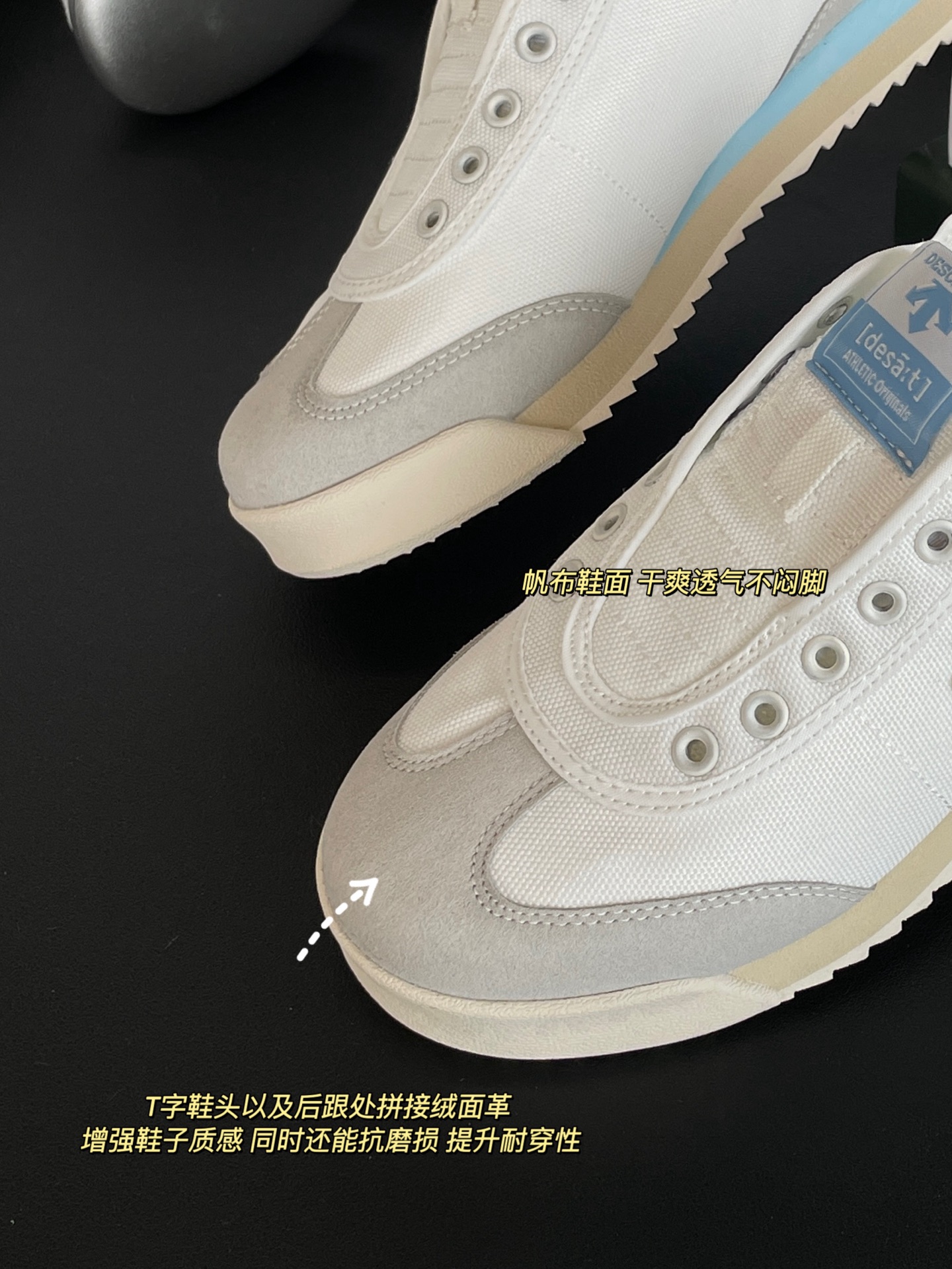 T字鞋头以及后跟处拼接绒面革材质 增强鞋子质感的同时还能抗磨损 提升耐穿性!