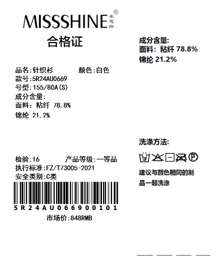 | 详细材质信息: | 面料:粘纤 78.8% 锦纶 21.2% | 主款式: | 圆领针织衫 |