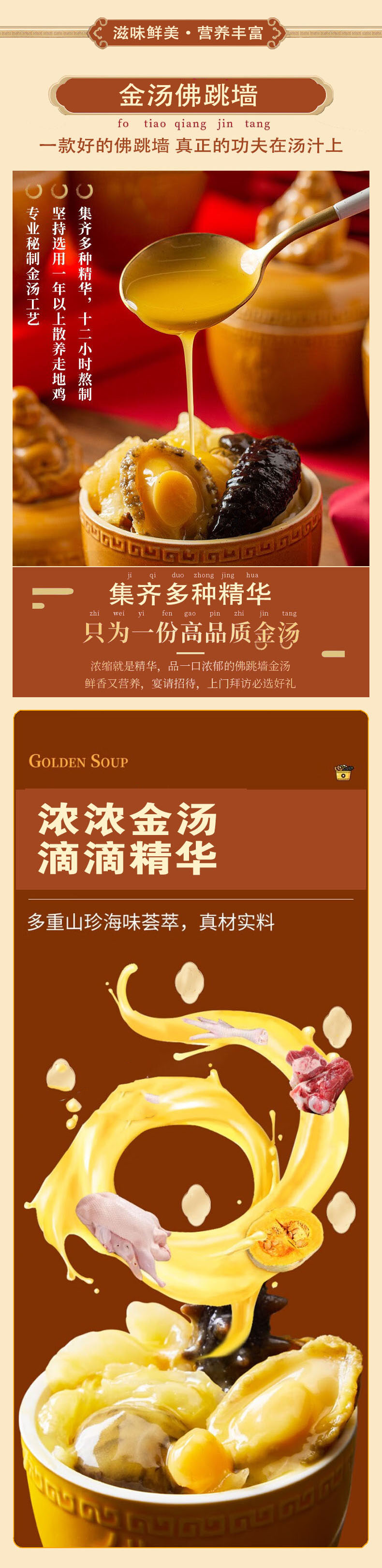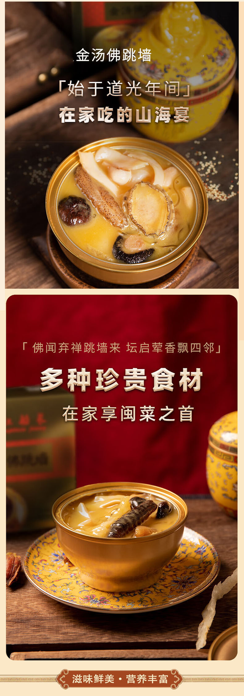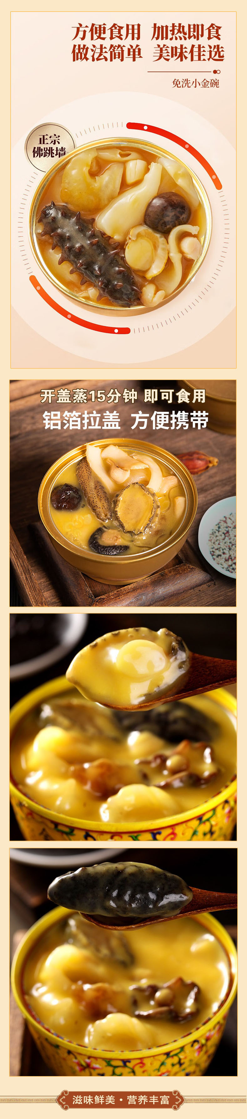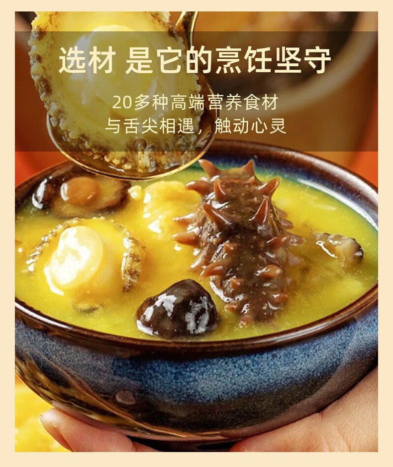 金汤佛跳墙,10罐组合,汇集8种山珍海味,精选整只海参鲍鱼及深海花胶等珍贵食材,搭配多种山珍,高品质金汤,富含多种维生素及营养物质,一款适合所有人的山海珍馐M
