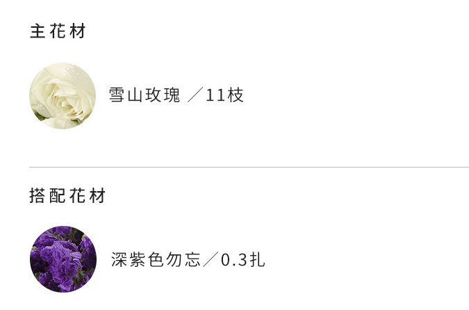 高档礼盒装鲜花:雪山玫瑰11枝、深紫色勿忘我0.3扎