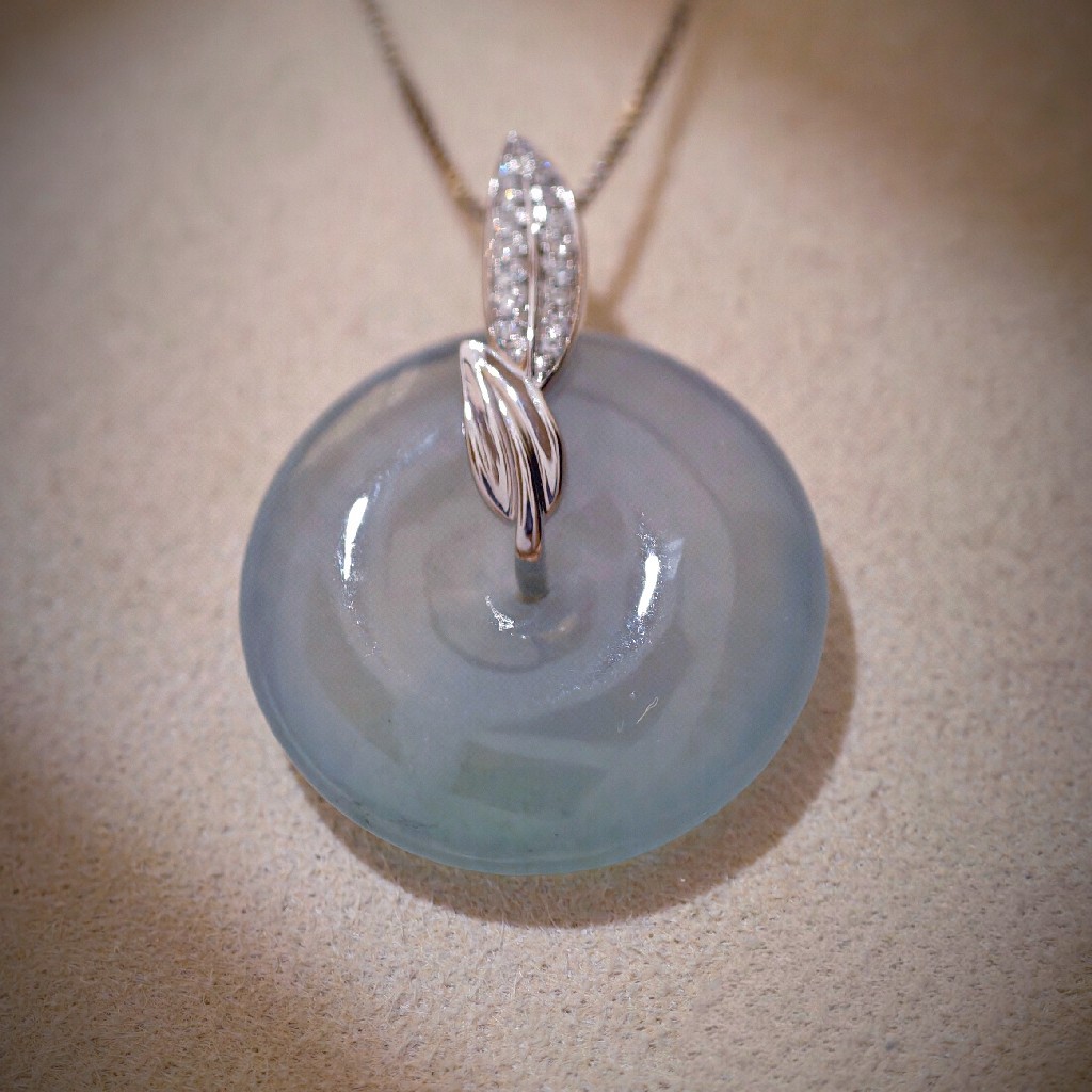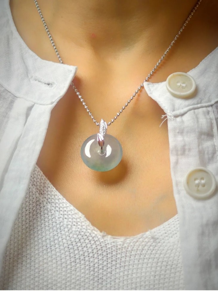 - 质感上,白色18K金的冷调光泽与这件翡翠平安扣的温润底色形成绝妙应和,既衬得翡翠愈发冰透莹润,又让钻石的光芒更显纯粹闪耀,整体色调干净统一,透着极简高级感。