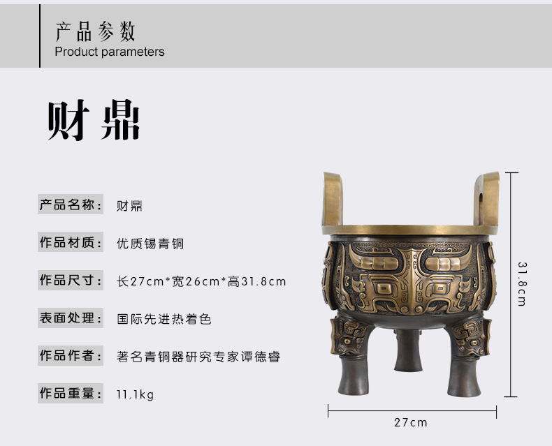 宇达青铜创意艺术品乔迁送礼家居办公室《财鼎》鼎铜摆件 高31.8cm