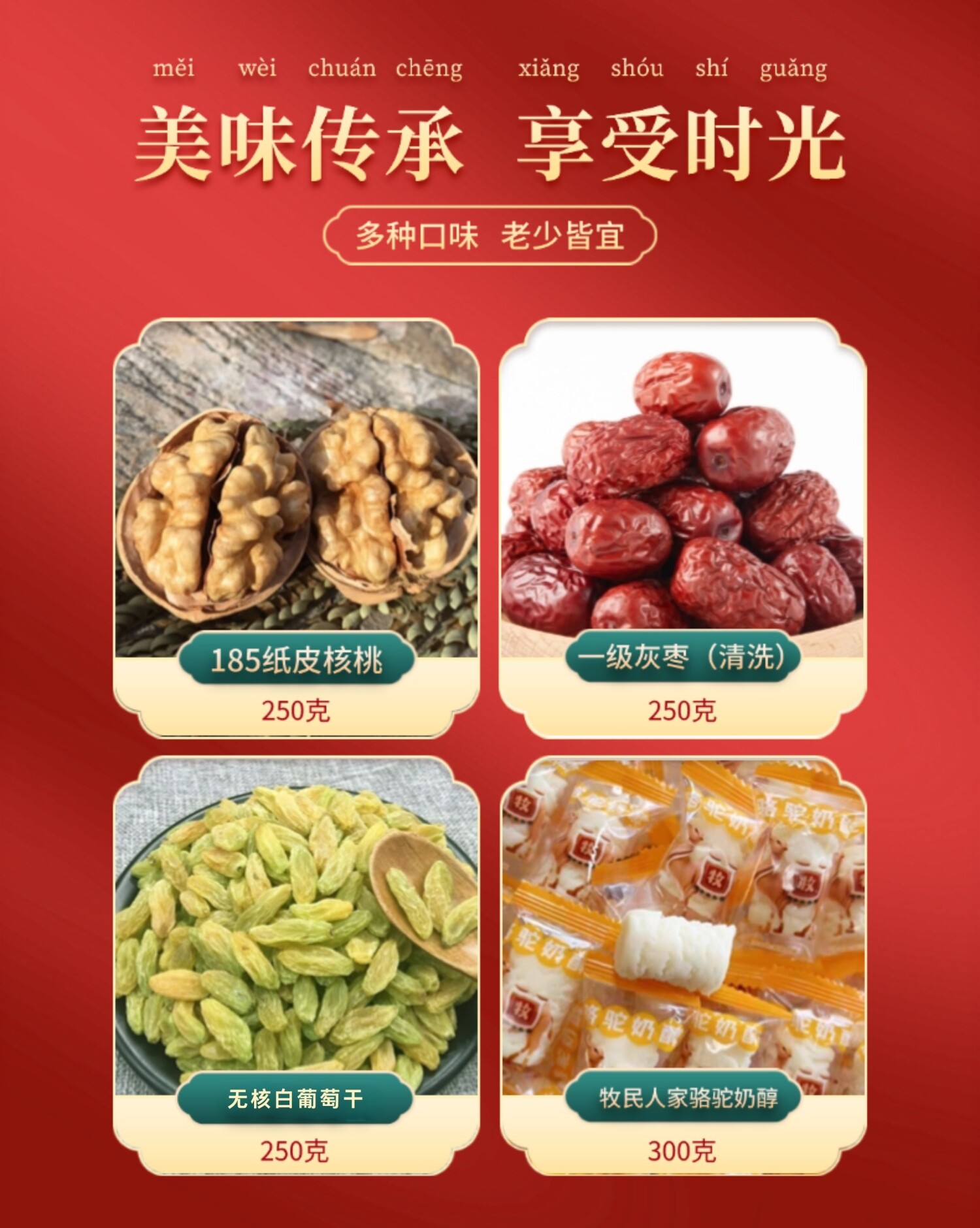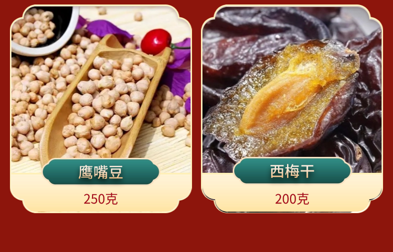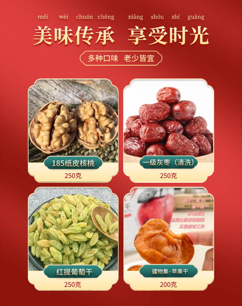 【规格】独立包装:185纸皮核桃250g/袋、灰枣一级洗250g/袋、无核白葡萄干250g/袋、苹果干200g/袋、鹰嘴豆250g/袋、西梅干200g/袋