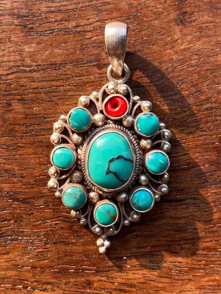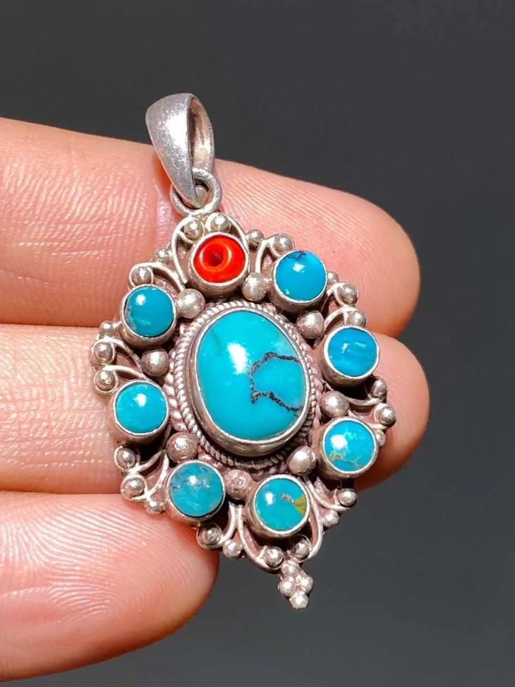 此天然绿松石镶银吊坠除顶端红珠非原珠外,保存完好无损。