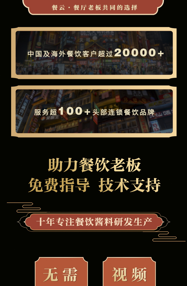 餐云标准化酱料为餐饮节约厨房人工成本30%,无厨师经验从业者通过标准化流程亦可操作,30名国内中餐大厨专家365天持续研发创新!