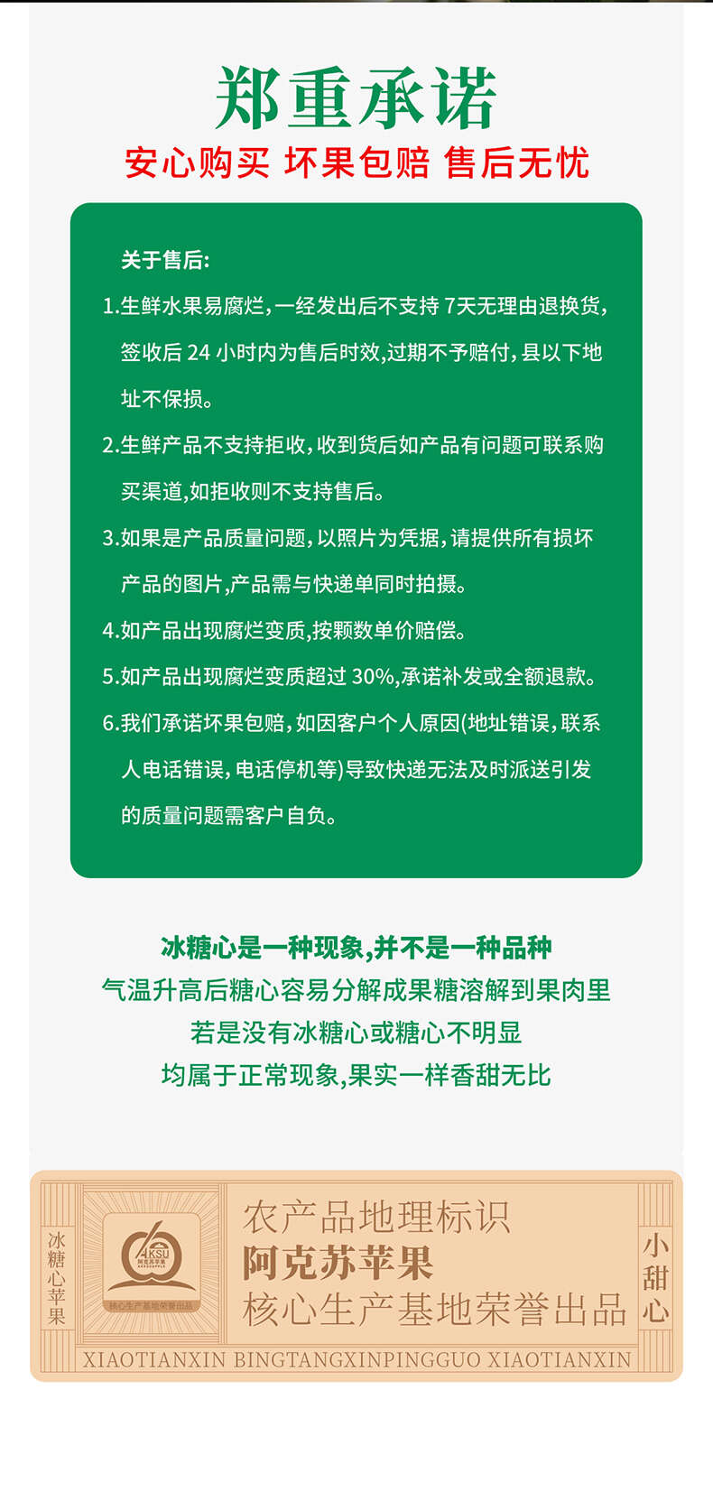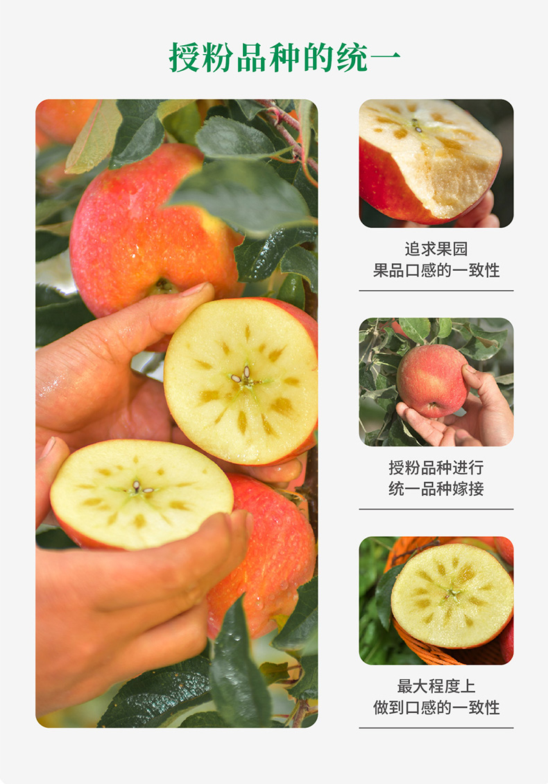 【温馨提示】由于贮存条件和气候等原因,糖分会溶解在果肉中,导致冰糖心会变浅或消失,但苹果甜度不会因此降低,请放心享用,糖心多少并不影响苹果品质,不属于售后范围哟~