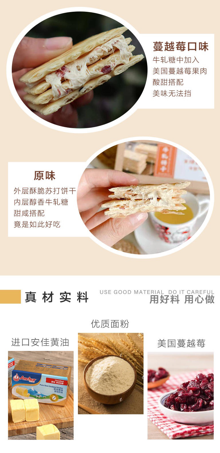 罗粑说食材:入口就惊艳了!酥脆的苏打饼干,搭配微软又有嚼劲牛扎糖,咸甜混合的口感,完美了!