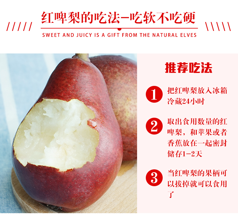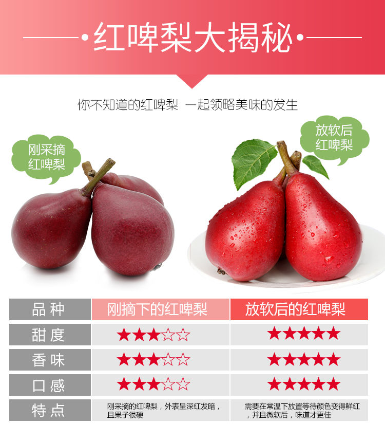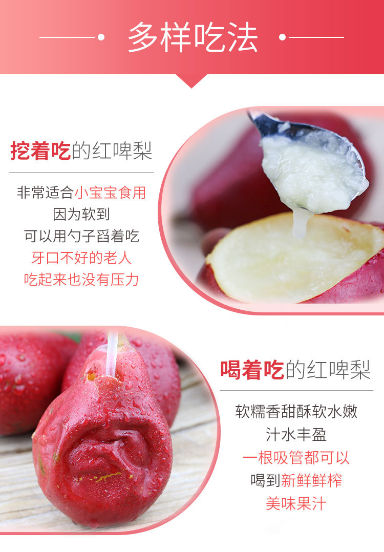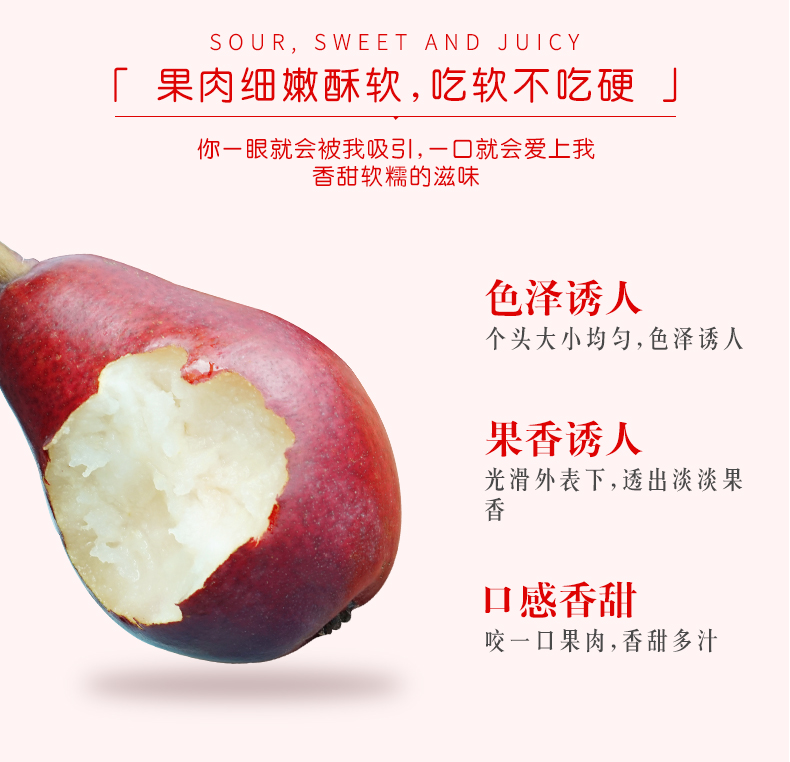 【卖点】色泽鲜红、形如葫芦、核小无渣、甜蜜多汁、可以吸得梨子
