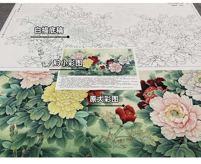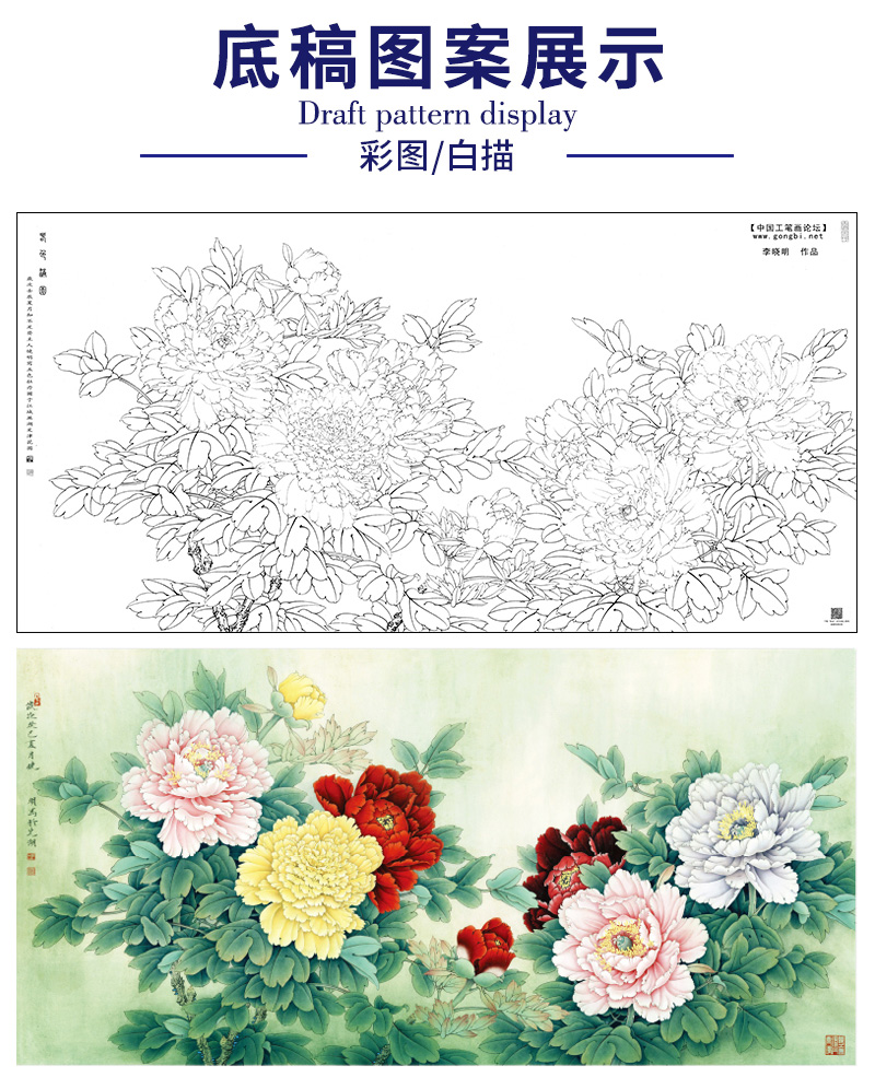 【大彩图】李晓明横幅工笔画白描底稿《春色满园》牡丹临摹勾线花鸟线稿KA20