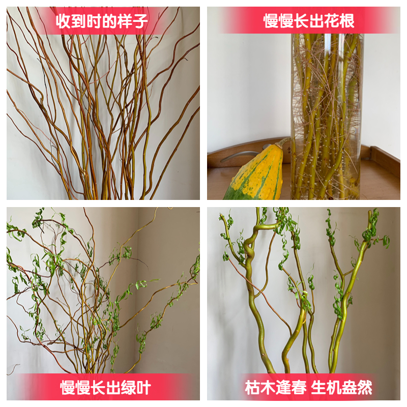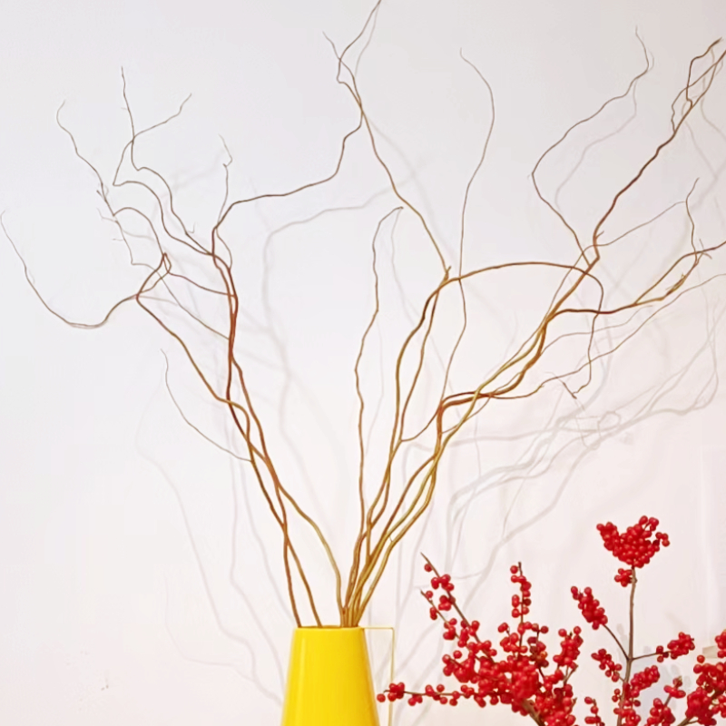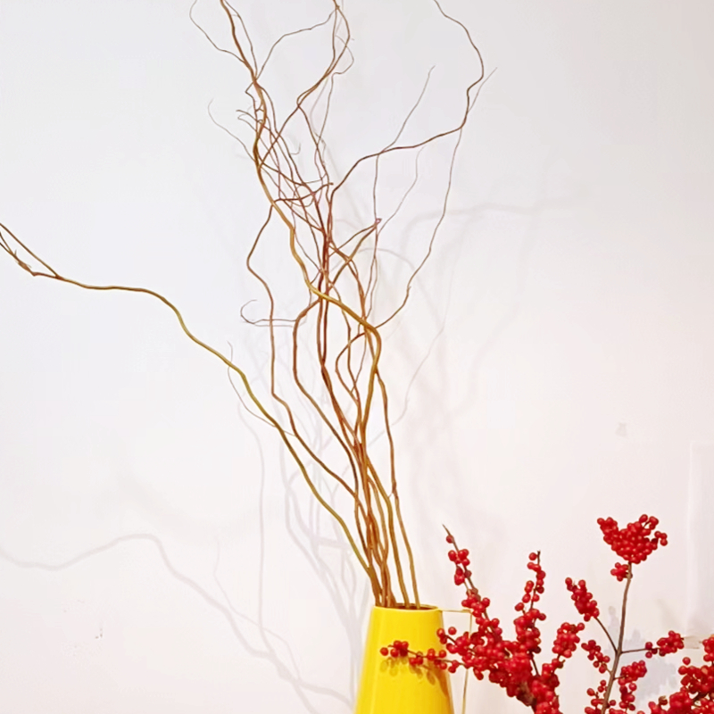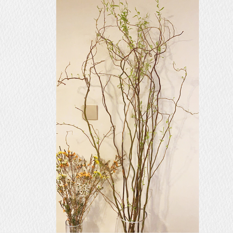 黄金龙柳单独插瓶或与其它花材搭配都很协调,细长曲折的枝条延伸关注视野,是谦和大气的花材。