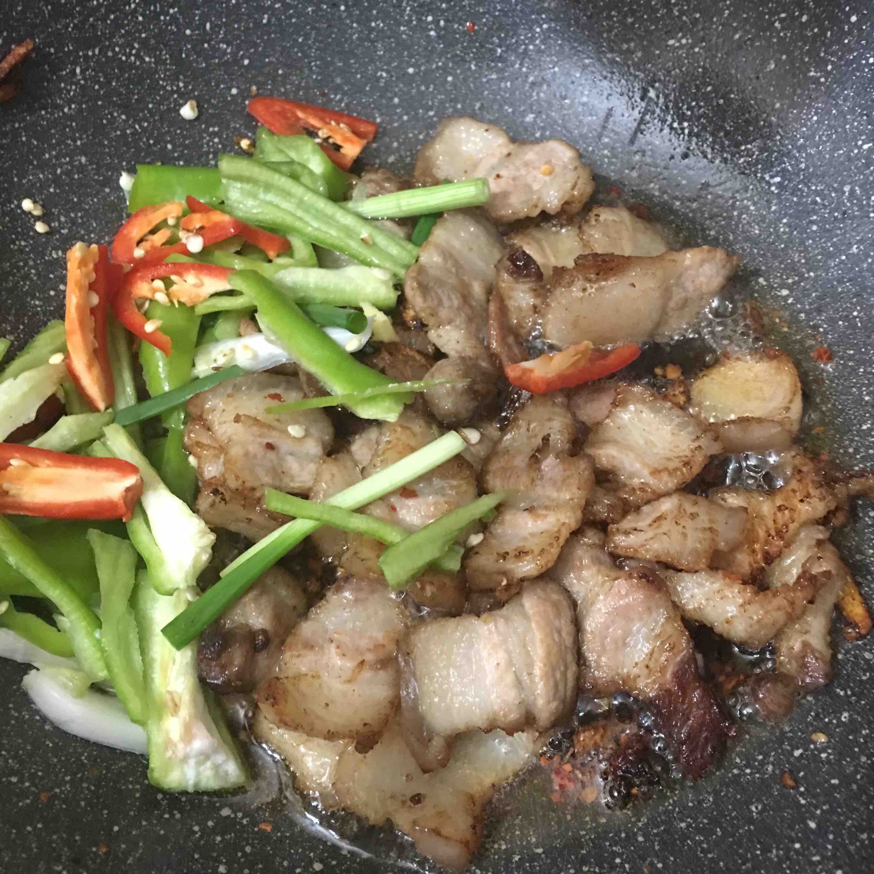 3.锅中留底油,放入豆瓣酱。炒出香味,再放入三层肉,加适量白糖,鸡精,少许盐,要少加,因为豆瓣酱已经有咸的。