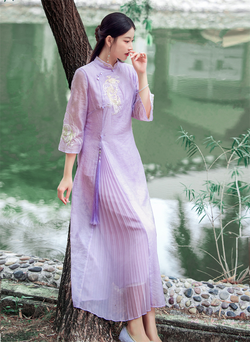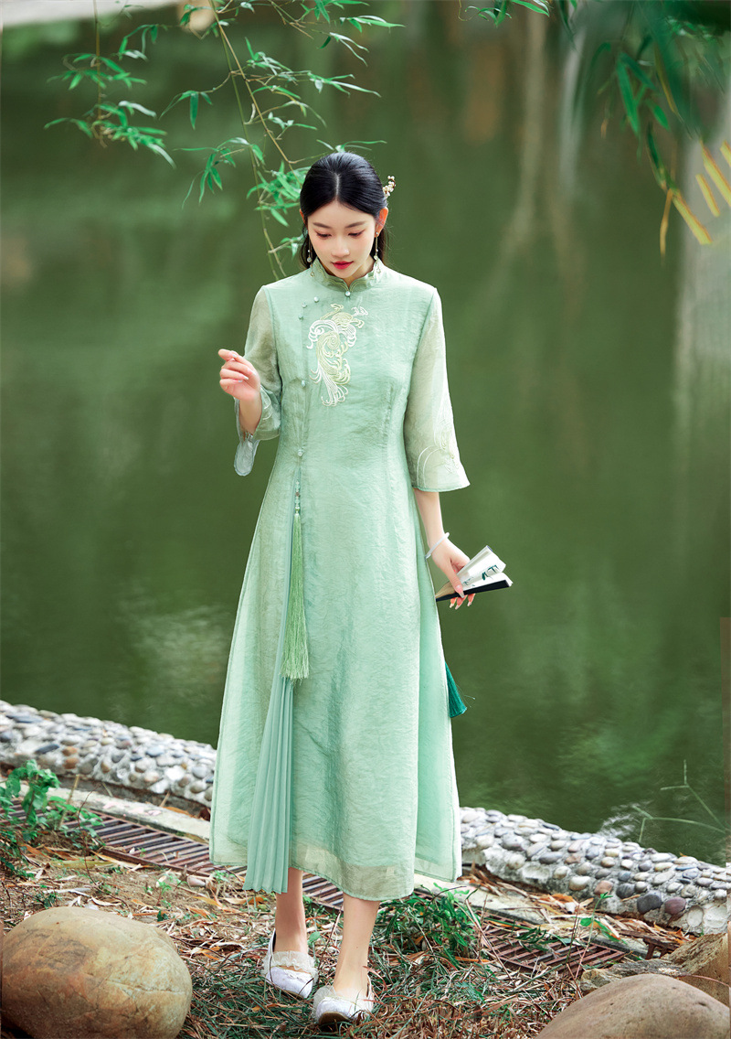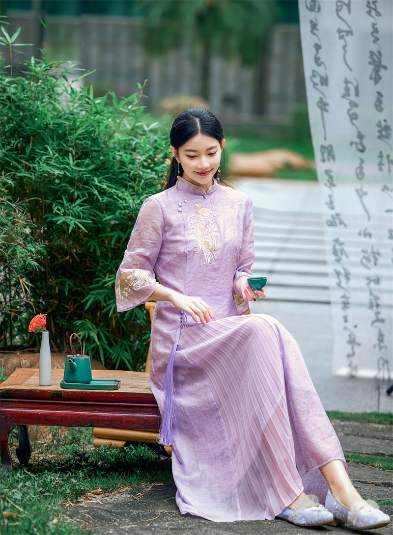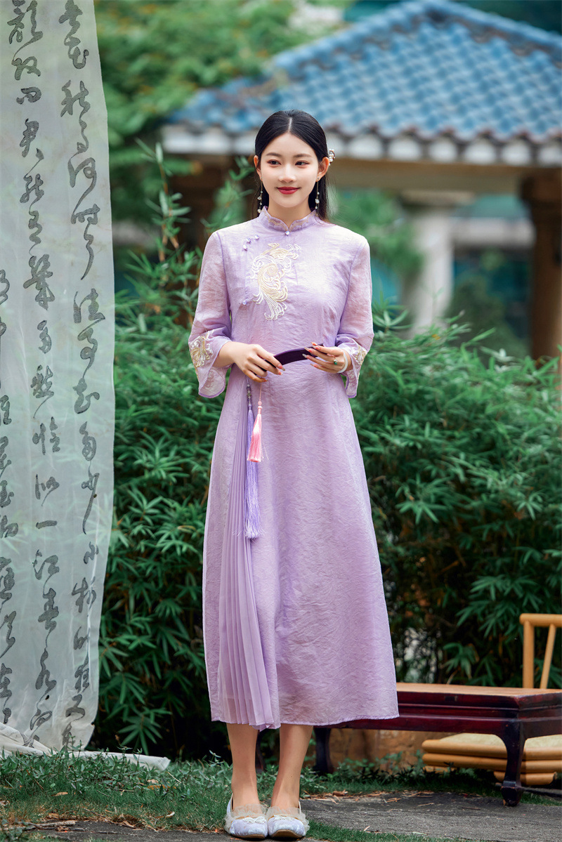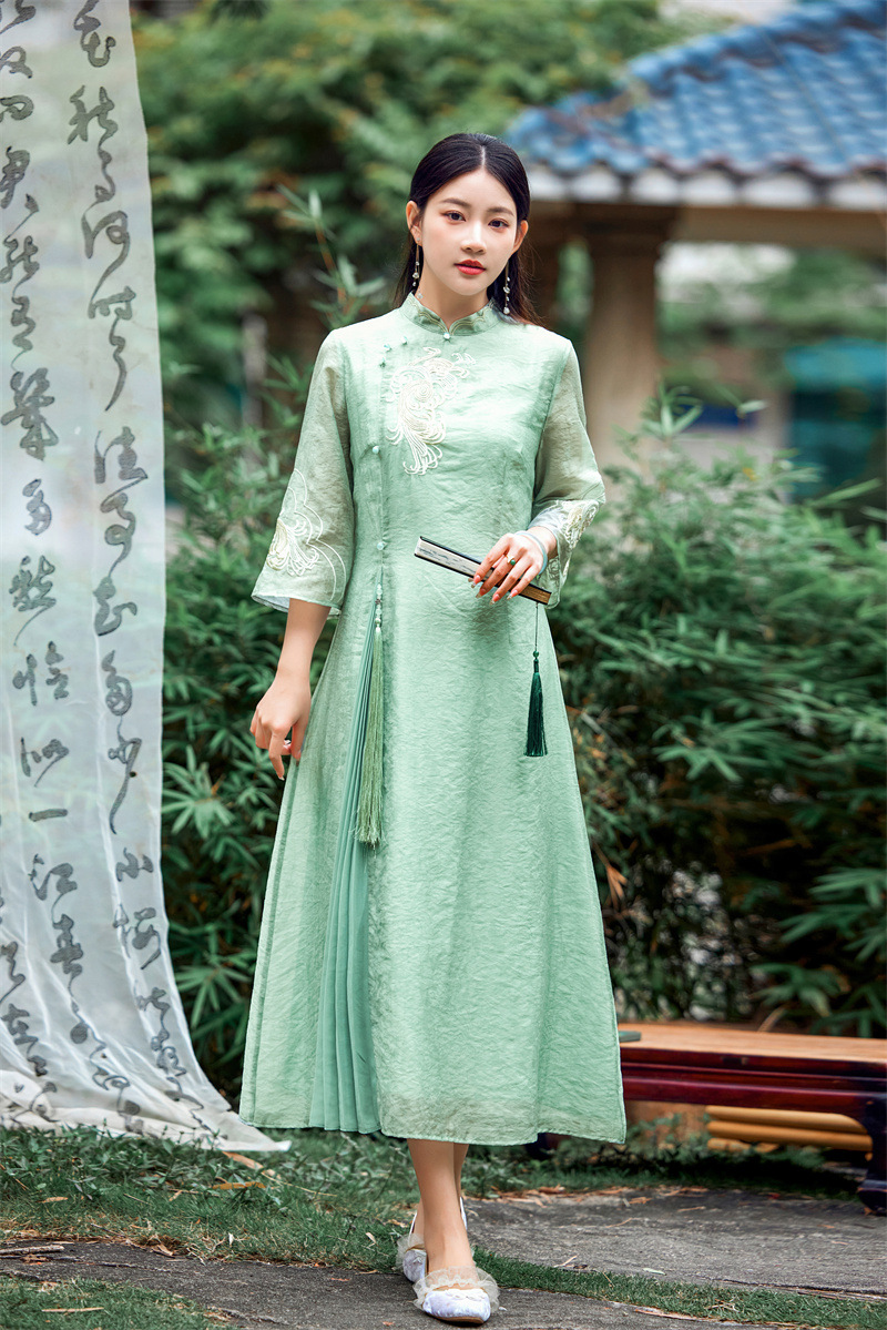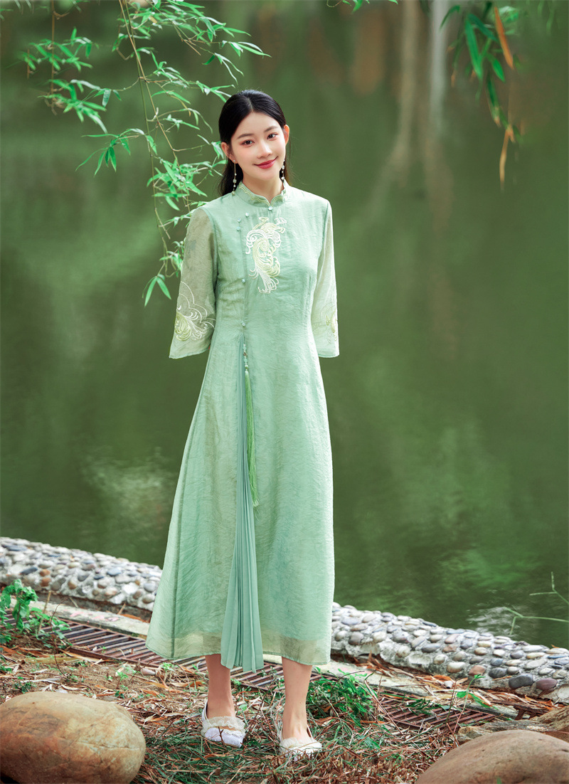 FLZD-2381夏季高定版改良旗袍流苏重工刺绣新中式国风开叉压褶连衣裙