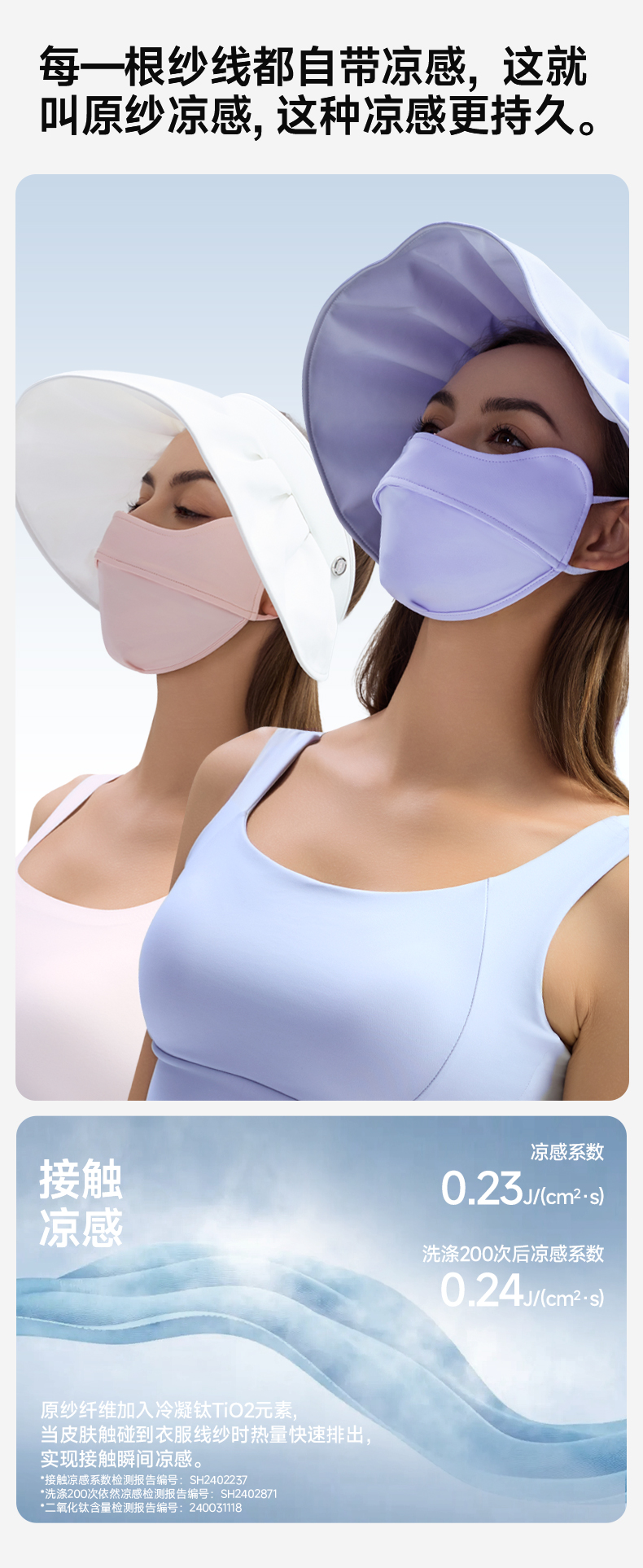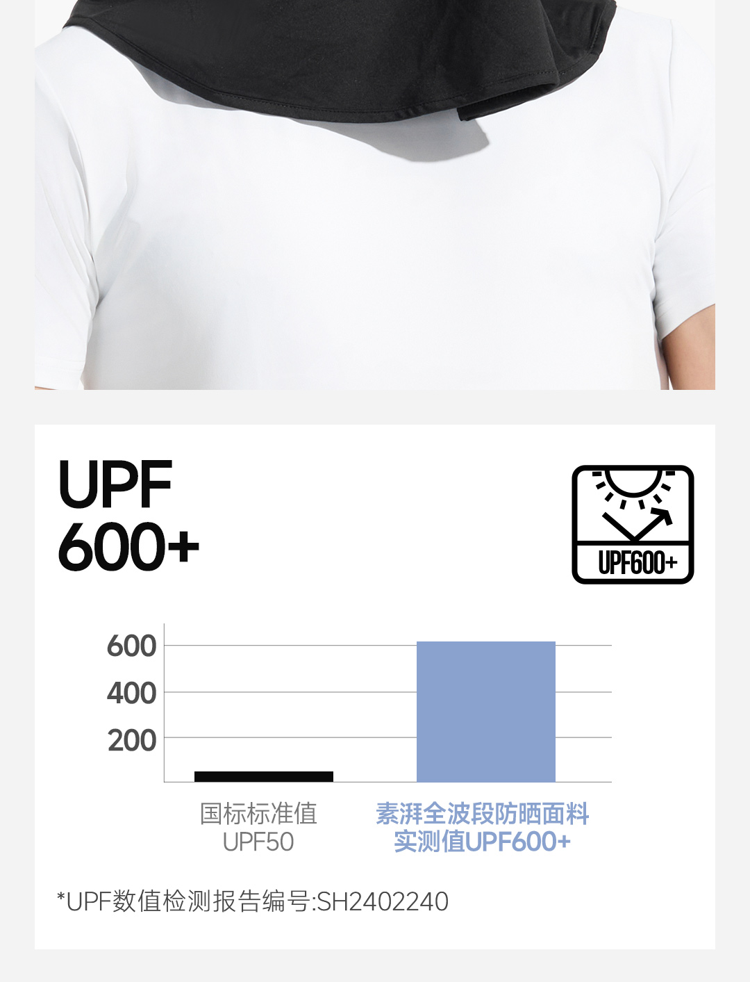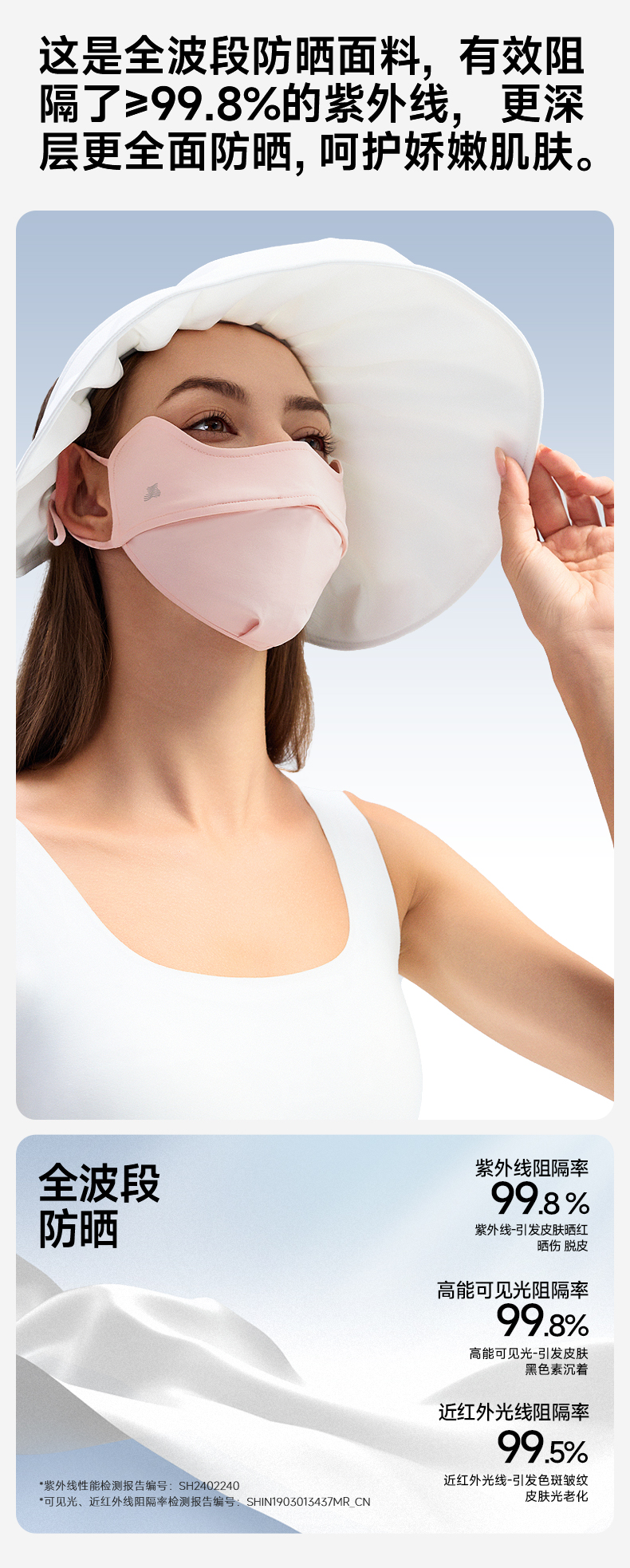 素湃全波段高倍数凉感防晒帽,全脸防晒 为你独当一面、国际皮肤癌基金会推荐;专利全波段防晒防蚊科技面料;UPF600+高倍数防晒;耐磨防勾丝陪你更久