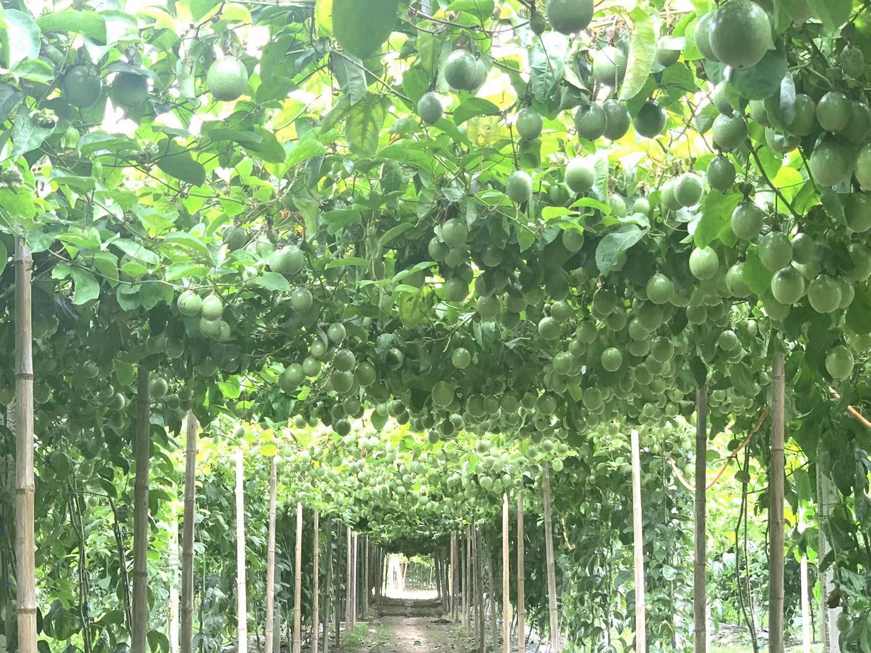 高架单藤吊果 使得百香果能最大限度地均匀受到日照,促进百香果的成熟、糖度的累积,高度离土可防止害虫对果实的侵害 果架之间的间隙有利于园内的通风,增加空气循环同时可以对果园进行控温作用