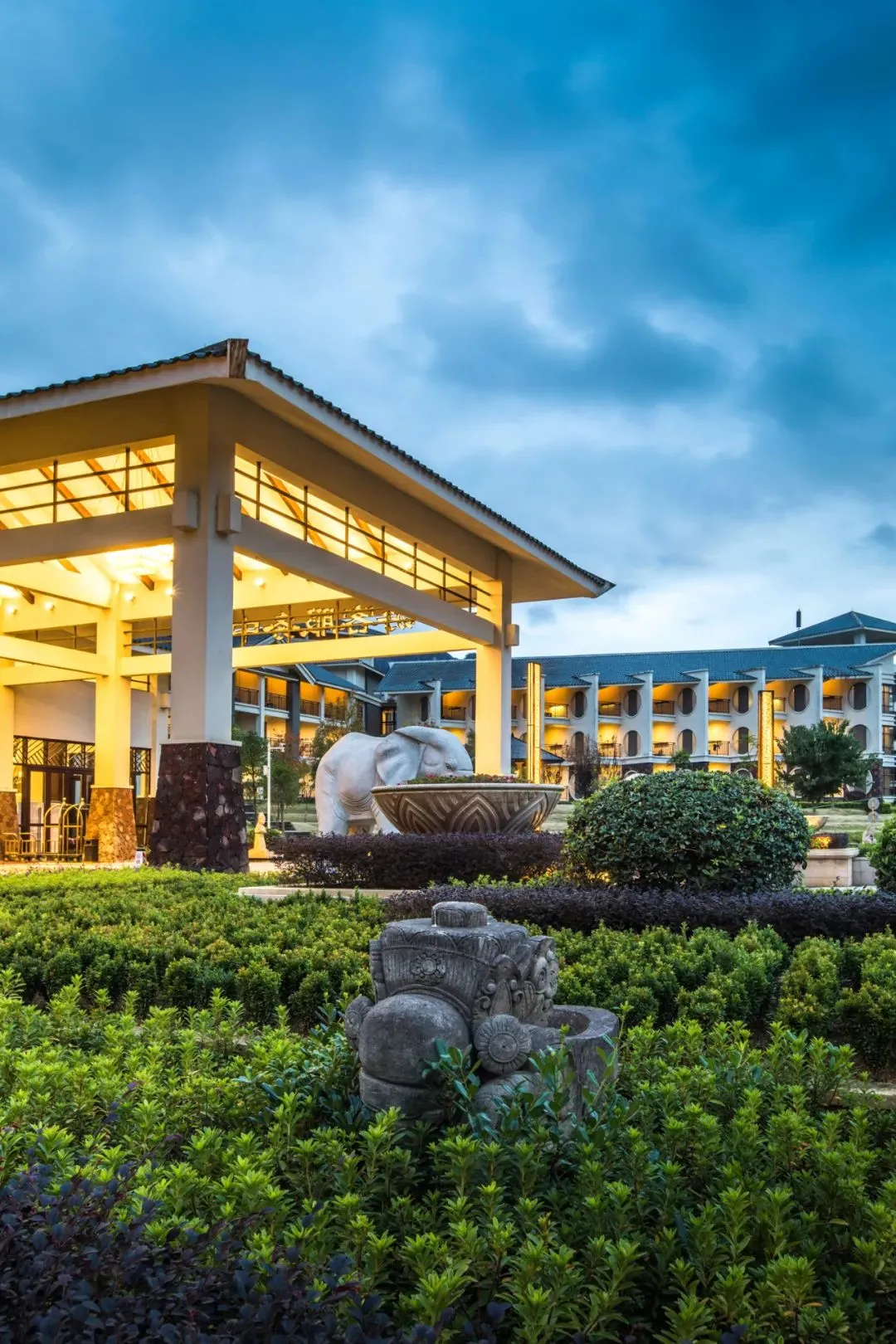 首先映入眼帘的便是独具印尼特色的大象雕塑喷水景观池、巴厘岛善恶之门舞台