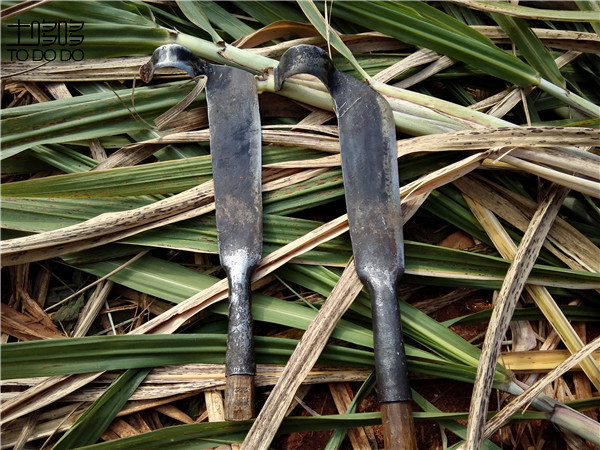 吃过早饭,就要下地开始忙碌的一天,背上水壶和捆扎的麻绳,带上简单的午饭到地里,尽可能的花更多时间来干活。砍甘蔗的刀是特质的,刀头上有一个小卷口,把甘蔗砍倒后,用刀上的小卷口顺势一拉,就能剔掉叶子。