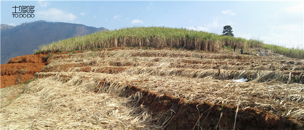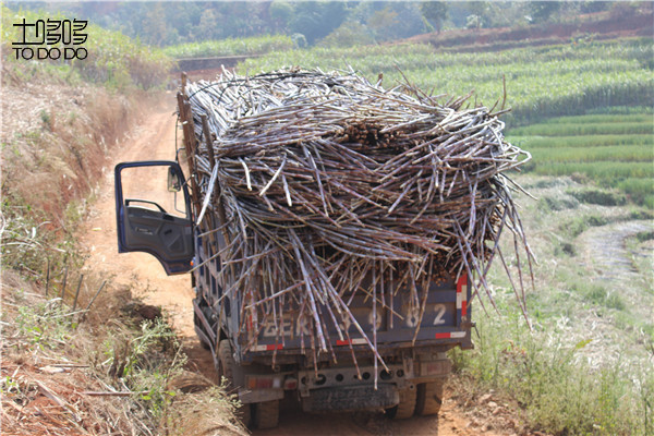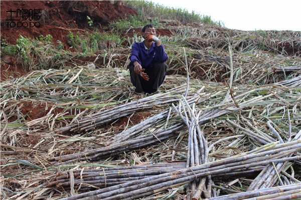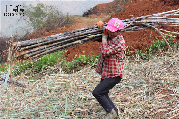 砍好的甘蔗需要人工一捆一捆的从台地里抗到土公路旁,每走一步都是爬坡上坎的,一整天下来,精疲力尽。