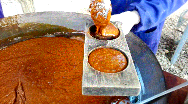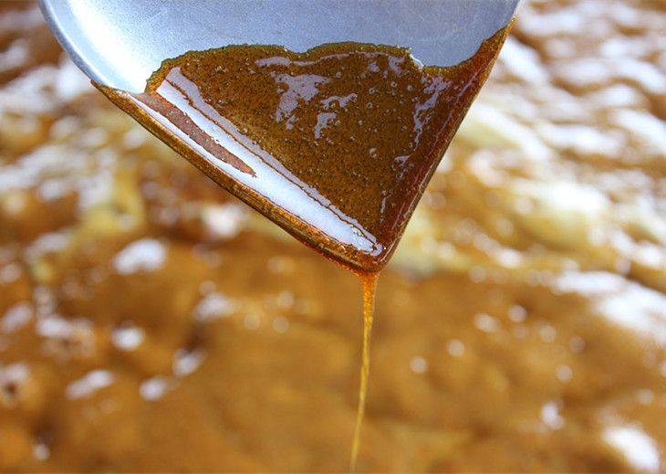 看着青悠悠的甘蔗汁不断的翻滚冒泡,到最后变成沸腾香浓,橙黄绵软的糖浆,收获感异常的满足。起锅的时刻很关键,起早了,糖不成行,起晚了,糖会糊锅。掌勺人守着大锅,一声令下,不耽误一分钟,将糖汁摇出来,手工迅速搅拌打砂,将糖浆里的热量迅速散发,就可以装模具了。
