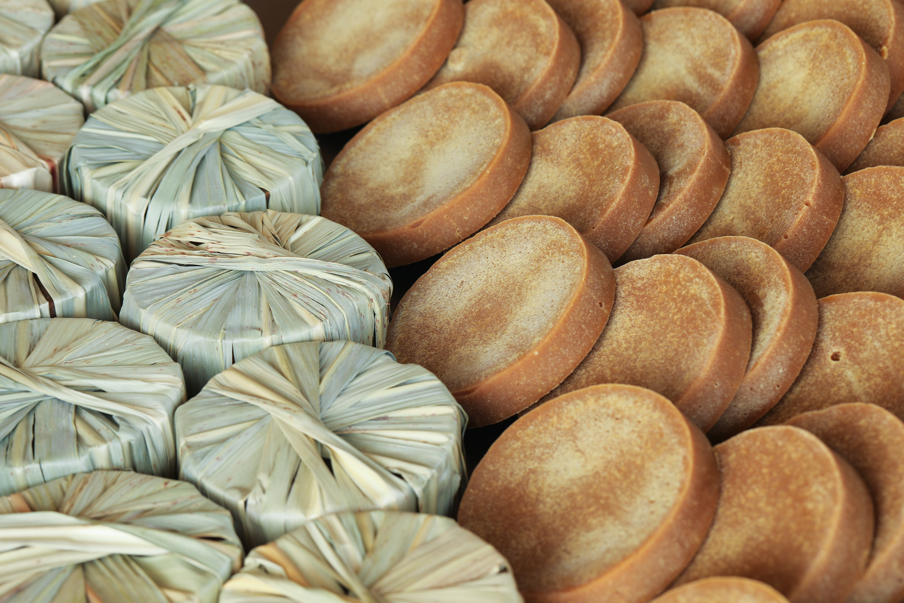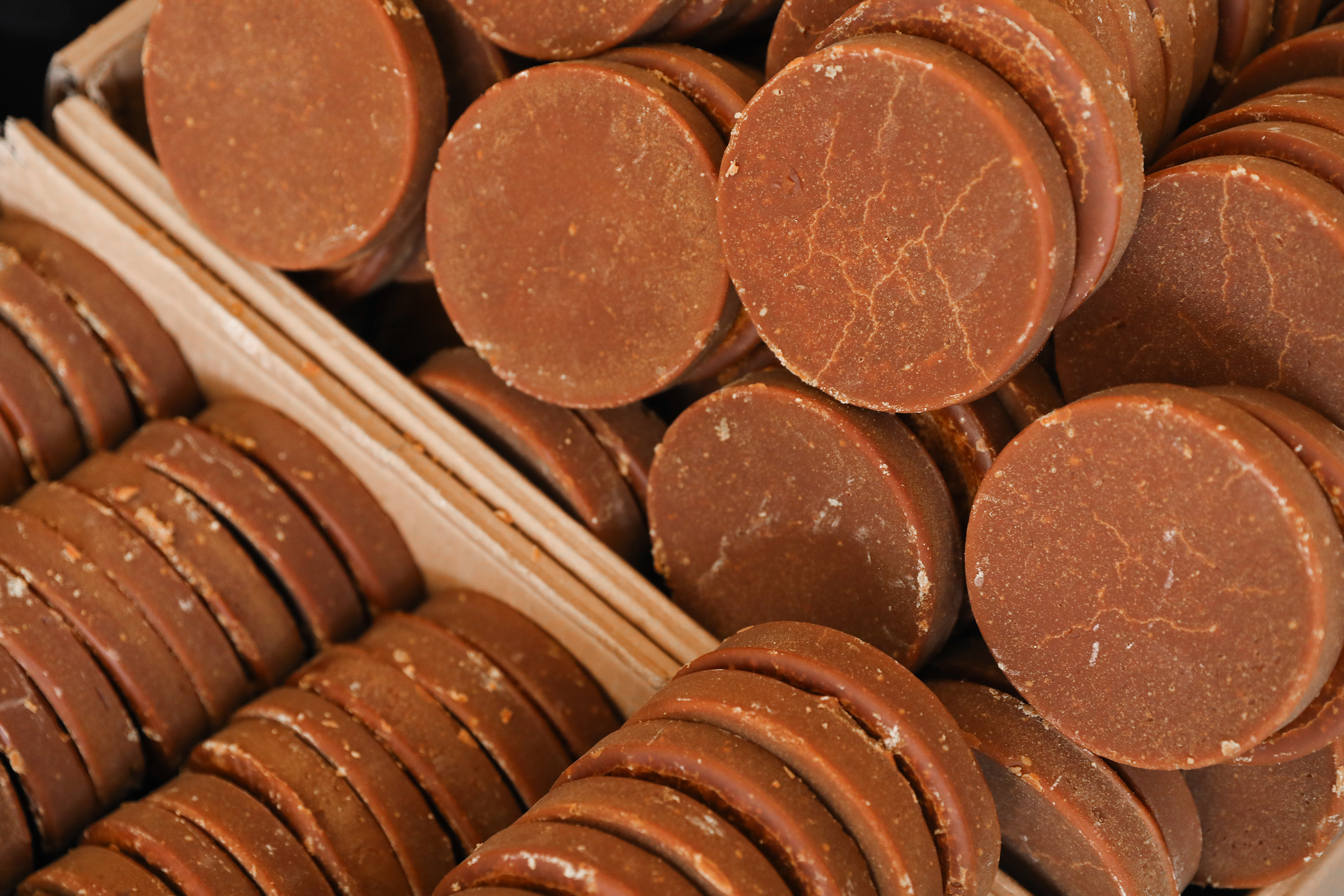 裹红糖的叶子是甘蔗枝稍上的嫩叶,砍后晒干存储,需要包裹的时候,在水蒸气烫软后烘干,就可以包红糖了,这一批糖模是去年专门请老木匠定制的,干燥的香樟木板上,掣出一个个带着细纹的凹槽。香甜的红糖带着淡淡香樟的清香,每一块都有熬糖人手心的温暖。