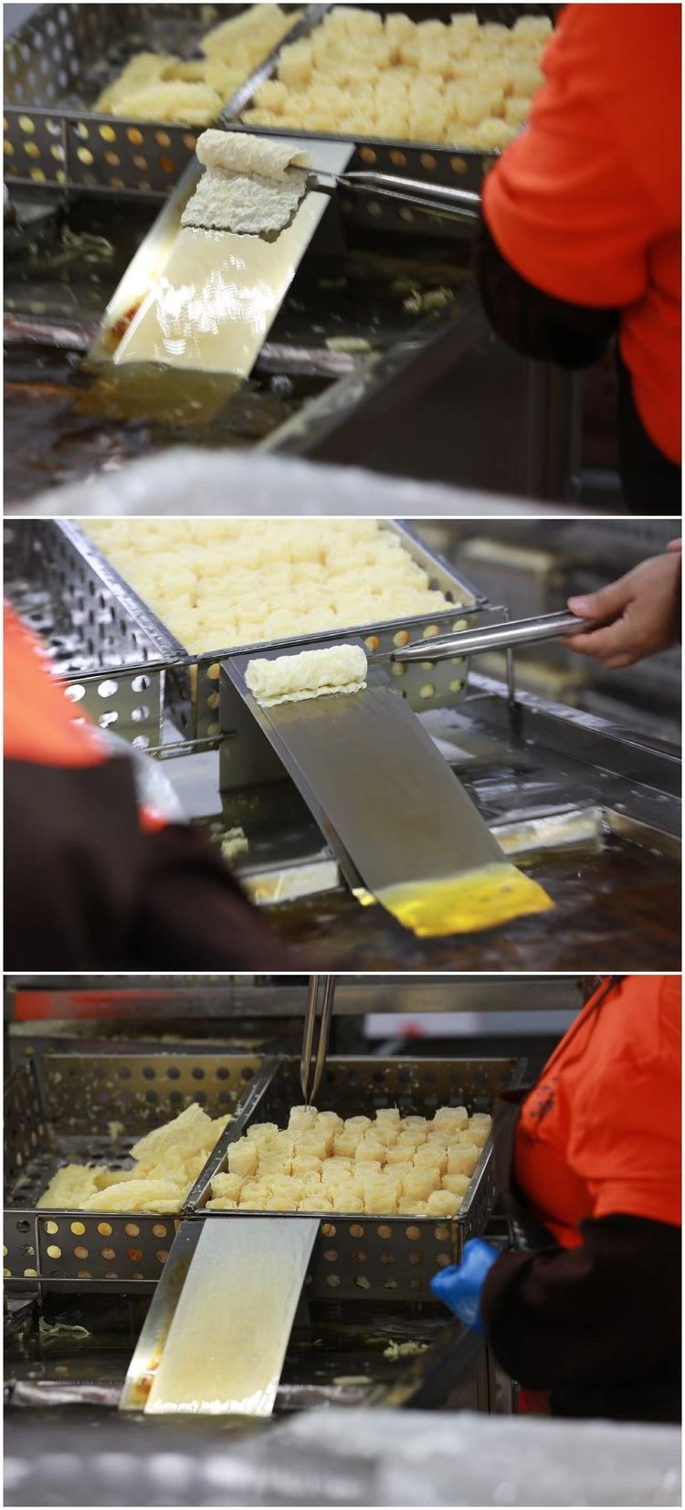 将小块豆皮放入油锅轻轻炸制成豆卷