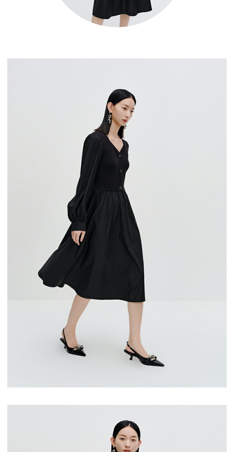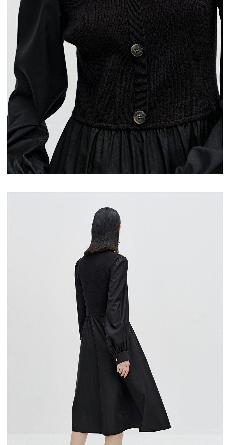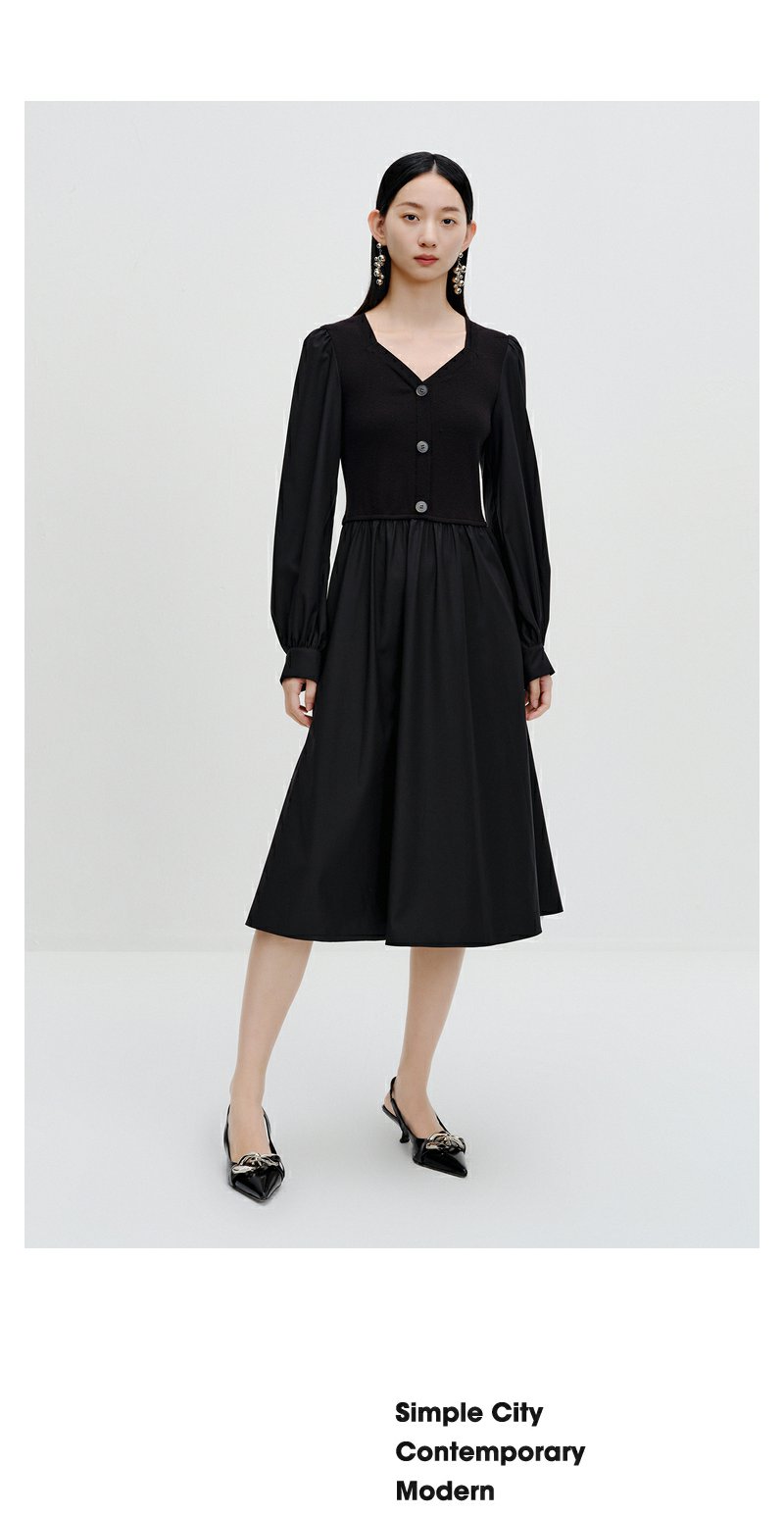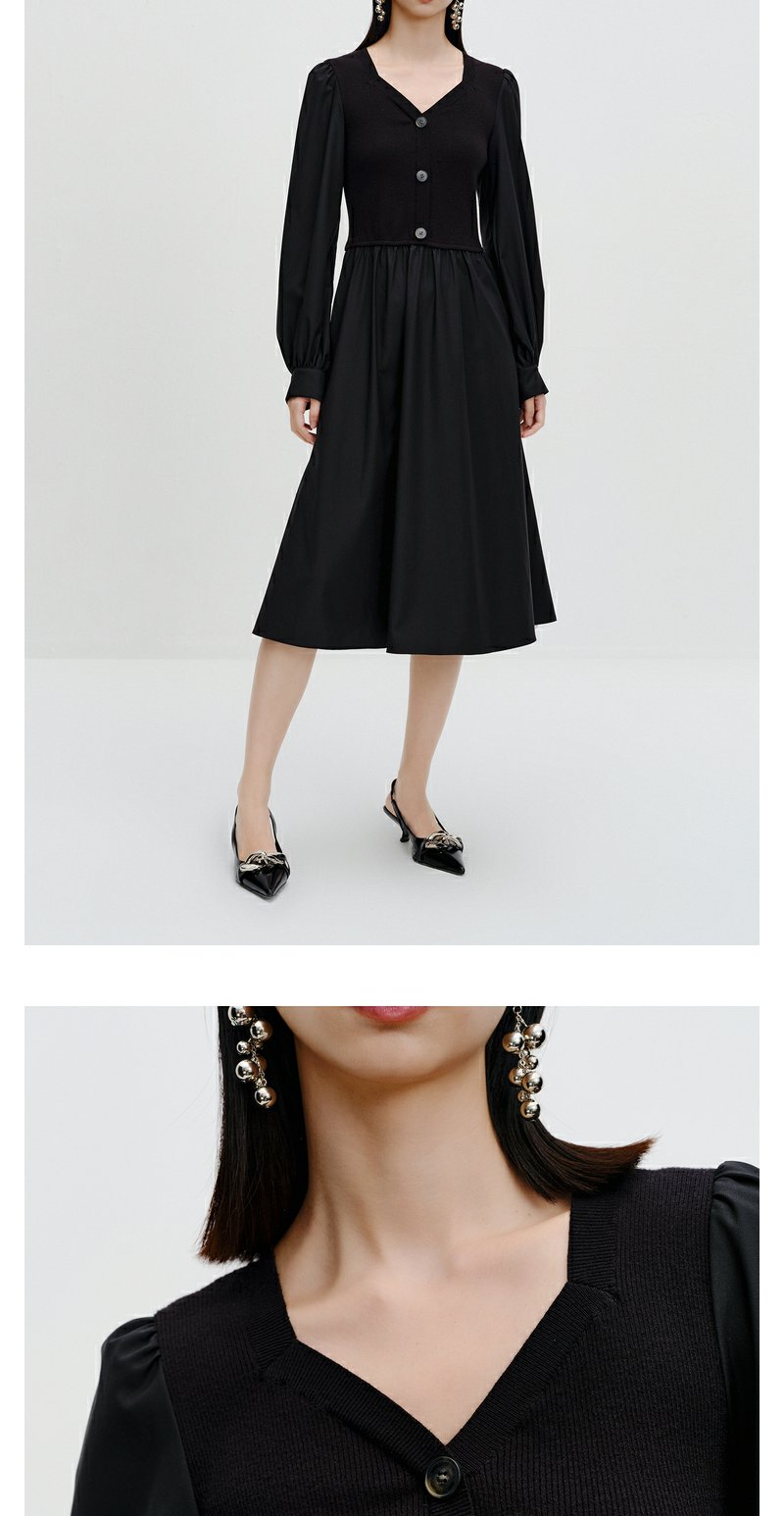 NEELLY纳俪商场同款泡泡袖针织拼接连衣裙秋季新款气质黑色中长裙N23082Y01115