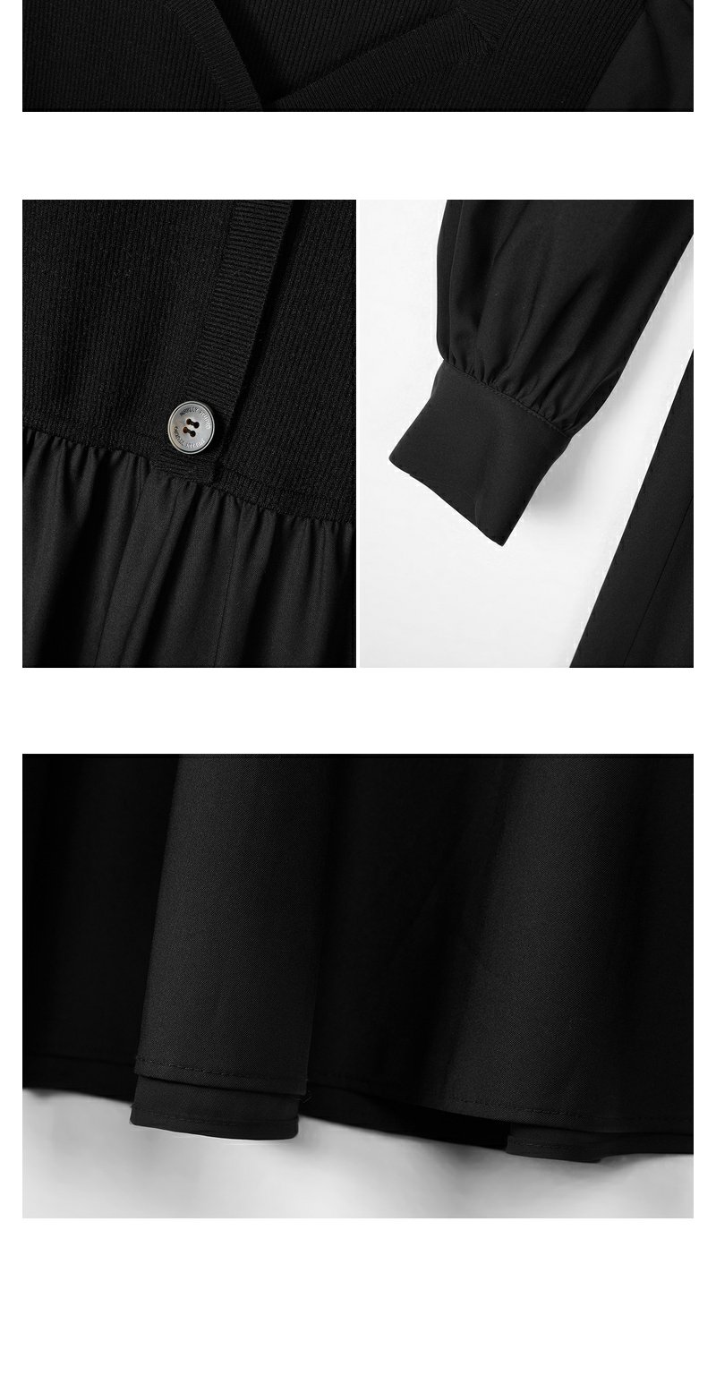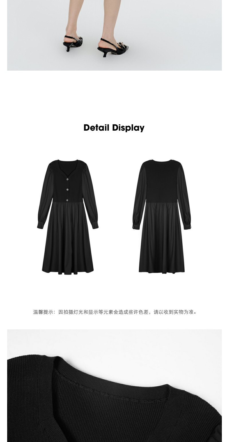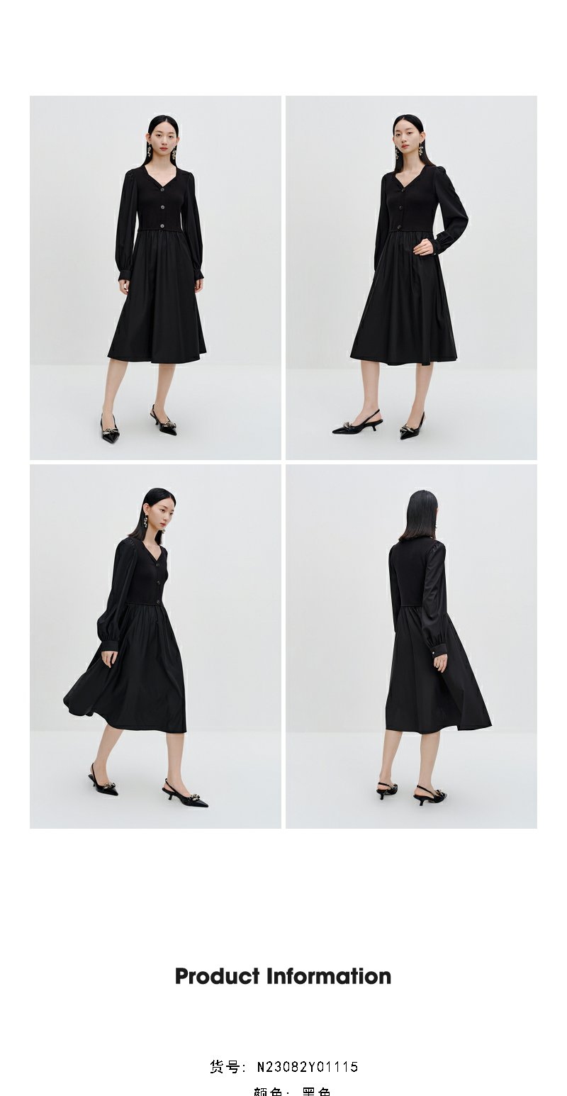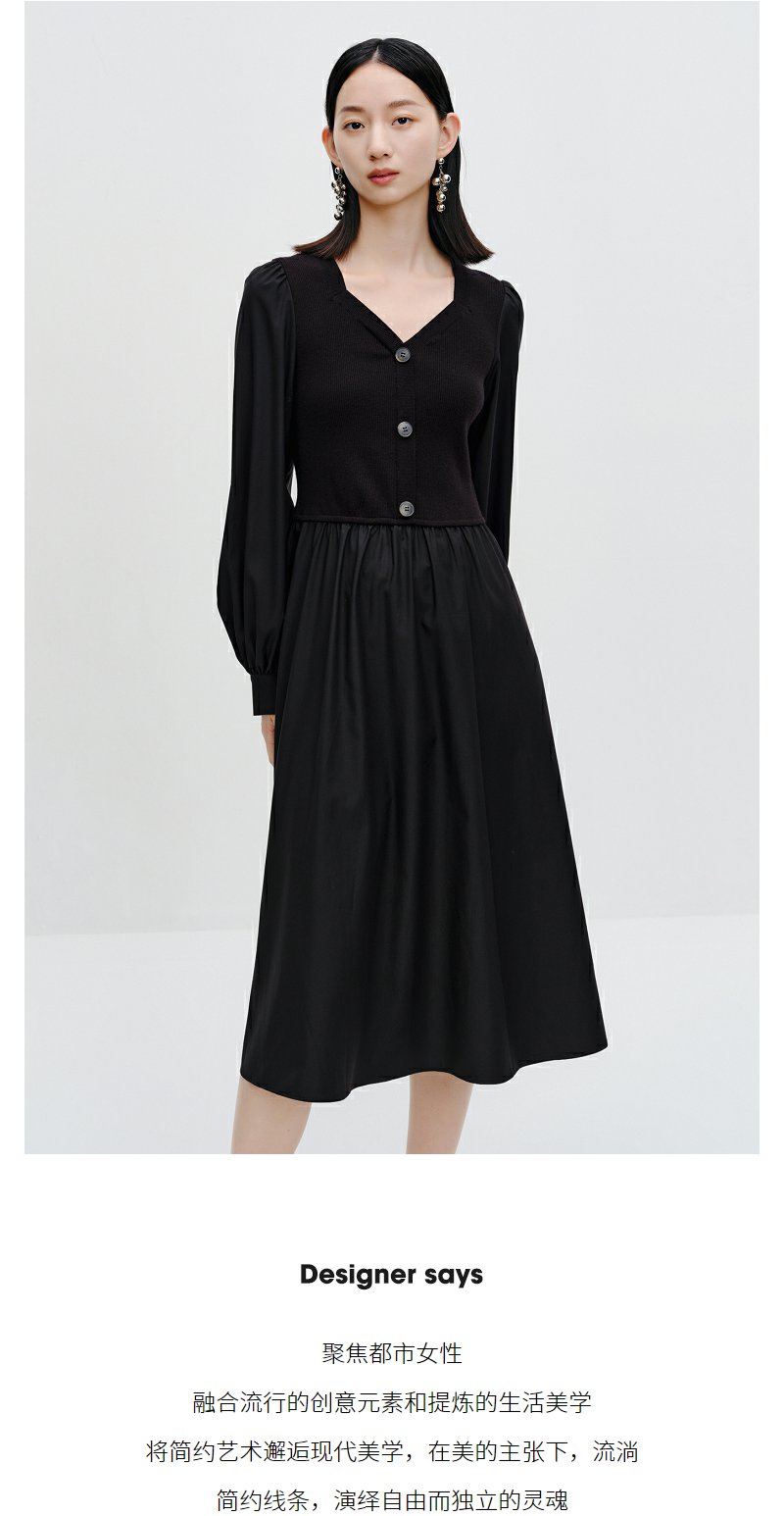 NEELLY纳俪商场同款泡泡袖针织拼接连衣裙秋季新款气质黑色中长裙N23082Y01115