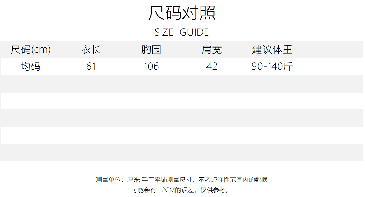 针织/服装类务必及时签收,及时验货,切勿水洗,穿过有味道或水洗不再售后!尺码建议仅供参考,因个人原因导致尺码大小的退换货,售后运费自理。