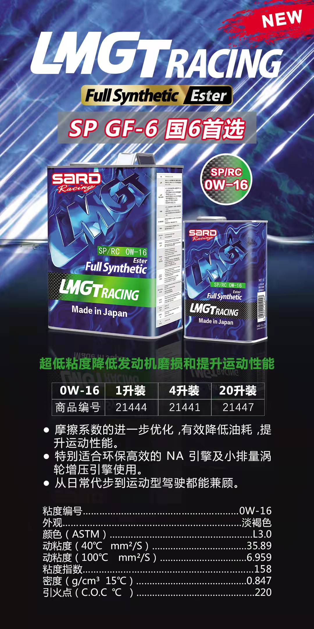 日本原装进口SARD 0W-16 SP/RC 超能量魅蓝竞技系列全合成润滑油 API SP认证 国6之选