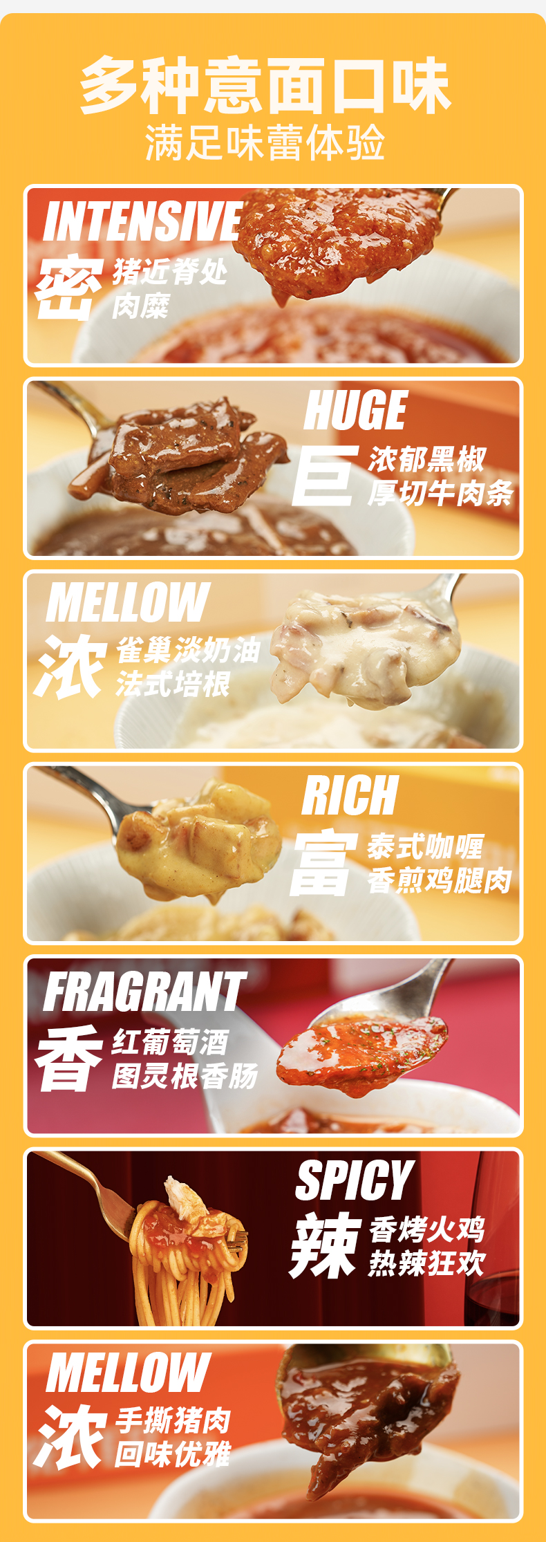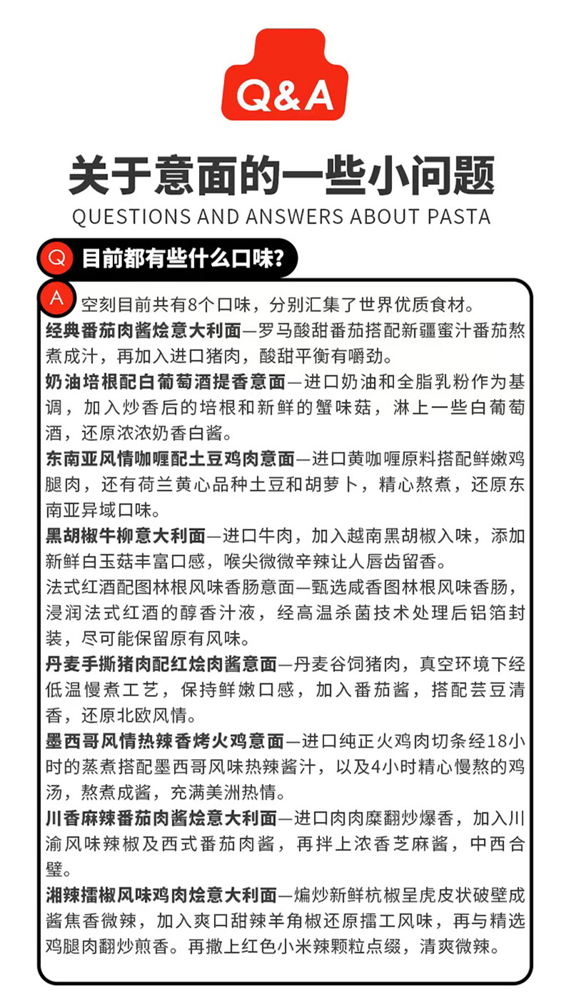 【口味】:番茄肉酱烩意大利面,黑胡椒牛柳意大利面,东南亚风情咖喱鸡肉意面,奶油培根配白葡萄酒提香意面、丹麦手撕猪肉红烩肉酱意面