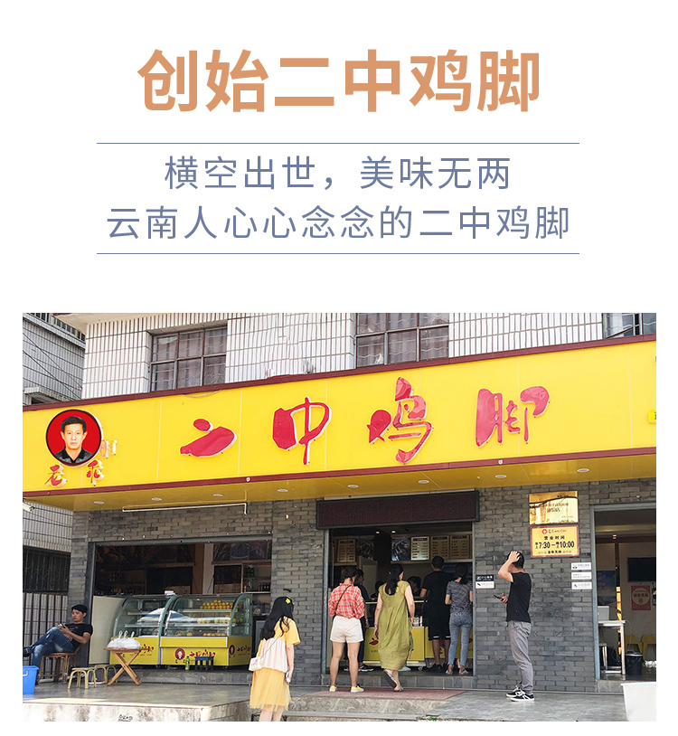 - “二中鸡脚’’是云南普洱的苏建云&金建华夫妇于1999年在思茅二中(现普洱一中)门口售卖自家精心制作的私房鸡脚,因为美味独特让人食指大动而名声大噪,从而得名“二中鸡脚”(意为二中门口售卖的鸡脚)